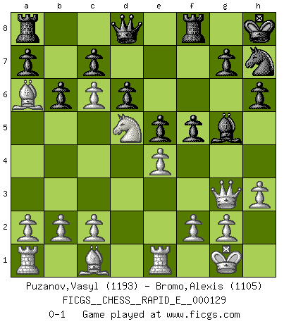 Last move : 0-1 2014 July 20 19:56:46 [Event "FICGS__CHESS__RAPID_E__000129"] [Site "FICGS"] [Date "2014.05.05"] [Round "1"] [White "Puzanov,Vasyl"] [Black "Bromo,Alexis"] [Result "0-1"] [WhiteElo "1193"] [BlackElo "1105"] 1.e4 e5 2.Nf3 Nc6 3.Bb5 d6 4.d4 h6 5.d5 Bg4 6.dxc6 b6 7.Nc3 Nf6 8.h3 Bh5 9.O-O Be7 10.Ba6 O-O 11.Qe2 Bxf3 12.Qxf3 Nh7 13.Qg3 Kh8 14.Re1 Bg5 15.Nd5 f5 0-1 Ruy Lopez : Old Steinitz defense Kingside Castling by player White (move 9) Kingside Castling by player Black (move 10) Player Black won this chess game. Follow this game move after move (download)In life, as in Chess, one's own Pawns block one's way. A man's very wealth, ease, leisure, children, books, which should help him to win, more often checkmate him. (Charles Buxton) Im Internet Chess Club betrug mein Rating vorübergehend 3350 ELO-Punkte. (Sergej Karjakin) El Peón aislado arroja penumbra sobre todo el tablero. (Aaron Nimzovich) La vie est comme un jeu d'échecs : nous esquissons un plan, mais celui-ci est tributaire de ce que daignent faire l'adversaire aux échecs et le destin dans la vie. (Arthur Schopenhauer) First of all, we have to go back to the classical time control. (Anatoly Karpov)