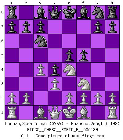 Last move : 0-1 2014 July 13 0:44:43 [Event "FICGS__CHESS__RAPID_E__000129"] [Site "FICGS"] [Date "2014.05.05"] [Round "1"] [White "Dsouza,Stanislaus"] [Black "Puzanov,Vasyl"] [Result "0-1"] [WhiteElo "0969"] [BlackElo "1193"] 1.c4 d5 2.Nc3 d4 3.Ne4 e5 4.d3 Nc6 5.Nf3 f5 0-1 This chess game has been lost on time (started : 2014.05.05 21:56:33) English Opening Player Black won this chess game. Follow this game move after move (download)Let the perfectionist play postal. (Yasser Seirawan) Man wirke der falschen Auffassung entgegen, als ob jeder Zug Unmittelbares zu leisten habe; auch Werte- und Ruhezüge haben ihre Existenzberechtigung. (Aaron Nimzowitsch) La vida es como un juego de Ajedrez, cambiando con cada movimiento. (Proverbio Chino) Aucun coup ne doit être joué sans but. (Pedro Damiano) Whenever people agree with me, I always feel I must be wrong. (Oscar Wilde)