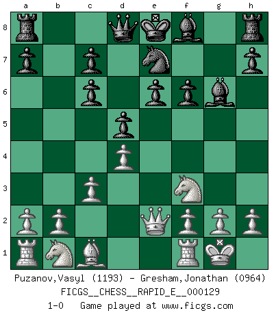 Last move : 1-0 2014 July 26 13:53:36 [Event "FICGS__CHESS__RAPID_E__000129"] [Site "FICGS"] [Date "2014.05.05"] [Round "1"] [White "Puzanov,Vasyl"] [Black "Gresham,Jonathan"] [Result "1-0"] [WhiteElo "1193"] [BlackElo "0964"] 1.e4 Nc6 2.d4 d5 3.e5 Bf5 4.Bb5 f6 5.Bxc6+ bxc6 6.Nf3 Bg6 7.O-O e6 8.c3 Ne7 9.exf6 gxf6 10.Qe2 1-0 This chess game has been lost on time (started : 2014.05.05 21:56:33) KP : Nimzovich defense Kingside Castling by player White (move 7) Player White won this chess game. Follow this game move after move (download)By the beauty of his games, the clarity of his play, and the brilliance of his ideas, Fischer made himself an artist of the same stature as Brahms, Rembrandt, and Shakespeare. (David Levy) Rubinstein ist ein Turmendspiel, welches die Götter vor tausenden von Jahren begannen. (Savielly Grigorievitsch Tartakower) El Ajedrez es 99 por ciento táctica. (Teichmann) Le jeu d'échecs est comme rejeté hors du temps. (Antoine de Saint-Exupéry) All war is based on deception. (Sun Tzu)