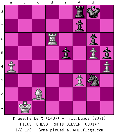 Last move : 1/2-1/2 2014 June 17 12:58:35 [Event "FICGS__CHESS__RAPID_SILVER__000147"] [Site "FICGS"] [Date "2014.05.09"] [Round "2"] [White "Kruse,Herbert"] [Black "Fric,Lubos"] [Result "1/2-1/2"] [WhiteElo "2437"] [BlackElo "2071"] 1.Nf3 c5 2.e4 d6 3.d4 cxd4 4.Nxd4 Nf6 5.Nc3 a6 6.Be3 e5 7.Nb3 Be6 8.f3 Be7 9.Qd2 O-O 10.O-O-O Nbd7 11.g4 b5 12.a3 Nb6 13.g5 Nh5 14.Na5 Rc8 15.Kb1 g6 16.h4 Qc7 17.Rh2 Rfe8 18.Nd5 Nxd5 19.exd5 Bxd5 20.Qxd5 Qxa5 21.c4 Rb8 22.cxb5 axb5 23.Bc4 Rf8 24.Bb3 Qa8 25.Rc2 Qxd5 26.Rxd5 Ng3 27.Rc7 Bd8 28.Rd7 Bb6 29.Bxb6 Rxb6 30.Bc2 b4 31.R5xd6 Rxd6 32.Rxd6 bxa3 33.bxa3 h5 34.a4 1/2-1/2 Reti Opening Kingside Castling by player Black (move 9) Queenside Castling by player White (move 10) This chess game ended in a draw. Follow this game move after move (download)A good sacrifice is one that is not necessarily sound but leaves your opponent dazed and confused. (Rudolph Spielmann) Frage des Reporters: -Welche besonderen Umstände rechtfertigen das Anhalten der Uhren während einer Turnierpartie? Antwort: -Einen Fotographen zu strangulieren. (Siegbert Tarrasch) Cuando tengo las piezas blancas, yo gano porque soy blanco; Cuando tengo las piezas negras, yo gano porque soy Bogolyubov. (Bogolyubov) La guerre est enfant de la passion, la passion est enfant du narcissisme et le narcissisme est l'enfant. (...) Une autre partie ? (Thibault de Vassal) A good player is always lucky. (Capablanca)