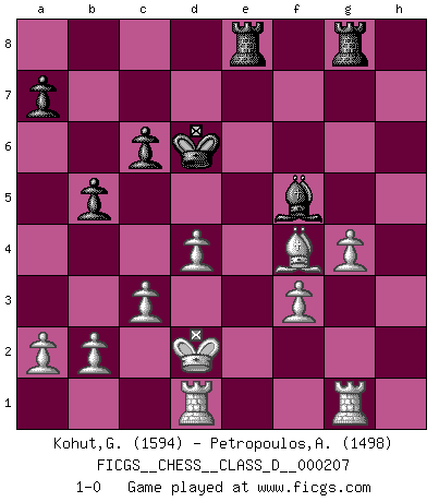 Last move : 1-0 2014 August 30 8:0:11 [Event "FICGS__CHESS__CLASS_D__000207"] [Site "FICGS"] [Date "2014.05.10"] [Round "1"] [White "Kohut,Gregory"] [Black "Petropoulos,Athanasios"] [Result "1-0"] [WhiteElo "1594"] [BlackElo "1498"] 1.e4 c6 2.d4 d5 3.Nc3 dxe4 4.Nxe4 Bf5 5.Ng3 Bg6 6.Bc4 Nf6 7.Nf3 e6 8.h4 h5 9.Ne5 Bh7 10.Nxh5 Nxh5 11.Qxh5 g6 12.Qg4 Bg7 13.Be3 f5 14.Qg3 Bxe5 15.Qxe5 Rf8 16.Qxe6+ Qe7 17.Qxe7+ Kxe7 18.O-O-O b5 19.Bg5+ Kd7 20.Bd3 Na6 21.c3 Rae8 22.Kd2 Nc7 23.h5 Ne6 24.hxg6 Bxg6 25.Bh4 Nf4 26.Rhg1 Bh5 27.f3 Rg8 28.Bxf5+ Kd6 29.g4 Bg6 30.Bg3 Bxf5 31.Bxf4+ 1-0 Caro-Kann : Classical variation Queenside Castling by player White (move 18) Player White won this chess game. Follow this game move after move (download)It is the aim of the modern school, not to treat every position according to one general law, but according to the principle inherent in the position. (Richard Reti) Ich rechne überhaupt nicht voraus. Ich gewinne auch so. (Robert James Fischer) De todos mis libros Rusos, la defensa contiene y difunde el 'calor' mas grande que pudiese verse extraño al observar lo supremamente abstracto que el Ajedrez supuestamente es. (Vladimir Nabokov) Psychologiquement, tu dois avoir confiance en toi même, mais cette confiance doit être basée sur des faits. (Robert Fischer) Perhaps chess is the wrong game for the times (The Chess Master and the Computer, by Garry Kasparov - 2010)