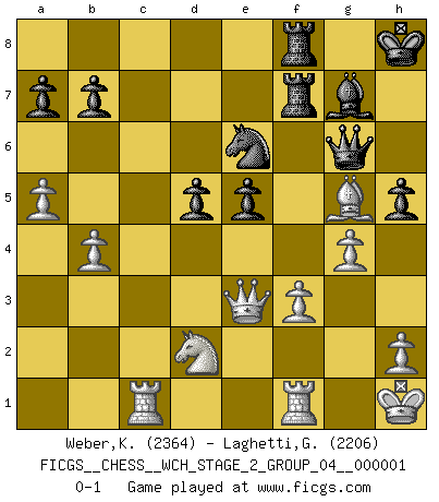 Last move : 0-1 2007 June 8 12:47:14 [Event "FICGS__CHESS__WCH_STAGE_2_GROUP_04__000001"] [Site "FICGS"] [Date "2007.02.15"] [Round "1"] [White "Weber,Karlheinz"] [Black "Laghetti,Gaetano"] [Result "0-1"] [WhiteElo "2364"] [BlackElo "2206"] 1.d4 Nf6 2.c4 g6 3.Nc3 Bg7 4.e4 d6 5.Nf3 O-O 6.Be2 e5 7.O-O Nc6 8.d5 Ne7 9.Ne1 Nd7 10.Nd3 f5 11.Bd2 fxe4 12.Nxe4 Nf6 13.Nxf6+ Bxf6 14.Bf3 Nf5 15.Be4 Bg7 16.Rc1 Nd4 17.c5 Bf5 18.Qe1 Qd7 19.f3 Qa4 20.Bg5 Bf6 21.Bh6 Rf7 22.a3 g5 23.cxd6 cxd6 24.Qe3 Kh8 25.Nf2 Qb5 26.Kh1 Rg8 27.g4 Bxe4 28.Nxe4 Qxd5 29.Rfd1 Qe6 30.Bxg5 Bg7 31.Nd2 Rgf8 32.Rf1 d5 33.b4 Qg6 34.a4 h5 35.a5 Ne6 0-1 This chess game has been lost on time (started : 2007.02.15 23:35:34) King's Indian : Orthodox, Aronin-Taimanov variation (Yugoslav attack / Mar del Plata variation) Kingside Castling by player Black (move 5) Kingside Castling by player White (move 7) Player Black won this chess game. Follow this game move after move (download)Every Chess master was once a beginner. (Chernev) Ja, jede Frau in Holland liebt mich bestimmt, und alle Männer hassen mich. (Loek van Wely) Después de una mala apertura, hay una esperanza en el juego medio. Pero una vez que estas en finales, el momento de la verdad ha llegado. (Edmar Mednis) Les erreurs sont comme les malheurs, elles n'arrivent jamais seules. (Siegbert Tarrasch) If you have any trouble condescending, find a Unix user to show you how it's done. (Scott Adams)