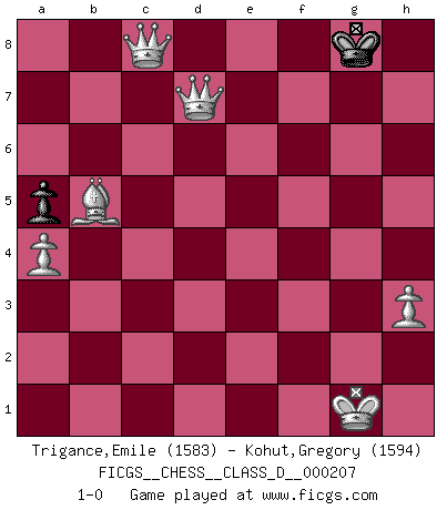 Last move : 1-0 2015 January 8 15:34:48 [Event "FICGS__CHESS__CLASS_D__000207"] [Site "FICGS"] [Date "2014.05.10"] [Round "1"] [White "Trigance,Emile"] [Black "Kohut,Gregory"] [Result "1-0"] [WhiteElo "1583"] [BlackElo "1594"] 1.e4 c5 2.Nf3 Nc6 3.d4 cxd4 4.Nxd4 g6 5.c4 Bg7 6.Be3 Nf6 7.Nc3 O-O 8.Be2 d6 9.O-O Bd7 10.Qd2 Nxd4 11.Bxd4 Bc6 12.f3 Nd7 13.Bxg7 Kxg7 14.Nd5 Bxd5 15.cxd5 a5 16.Rac1 b6 17.Rc6 Ne5 18.Qd4 f6 19.Rxb6 Rc8 20.f4 Nd7 21.Rc6 Nc5 22.Bb5 Rb8 23.a4 Ra8 24.Rb1 Kg8 25.b4 Qb8 26.bxc5 dxc5 27.Qxc5 Qa7 28.Rc1 Qxc5+ 29.R1xc5 Ra7 30.Bc4 Rd8 31.Ra6 Rxa6 32.Bxa6 Rb8 33.Rb5 Ra8 34.Rb6 h5 35.h3 Kf7 36.d6 exd6 37.Rxd6 Ke7 38.e5 fxe5 39.fxe5 Kf7 40.Bc4+ Kg7 41.Rd7+ Kf8 42.Rf7+ Ke8 43.e6 Rc8 44.Bb5+ Kd8 45.Rf8+ Kc7 46.Rxc8+ Kxc8 47.e7 Kc7 48.e8Q Kd6 49.Qxg6+ Kd5 50.Qxh5+ Kd6 51.Qe2 Kd5 52.g4 Kd4 53.g5 Kd5 54.g6 Kd6 55.g7 Kd5 56.g8Q+ Kc5 57.Qe2c4+ Kd6 58.Qg8d5+ Ke7 59.Qc4c6 Kf8 60.Qd5d7 Kg8 61.Qc6c8+ 1-0 Sicilian : Accelerated Fianchetto, Maroczy bind, 6.Be3 Kingside Castling by player Black (move 7) Kingside Castling by player White (move 9) 10 pieces endgame at move 46 : White KBPPPP , Black KPPP WHITE : King + 1 Bishop 4 Pawns BLACK : King + 3 Pawns Promotion Queen by player White (move 48) 9 pieces endgame at move 49 : White KQBPPP , Black KPP WHITE : King + 1 Queen 1 Bishop 3 Pawns BLACK : King + 2 Pawns 8 pieces endgame at move 50 : White KQBPPP , Black KP WHITE : King + 1 Queen 1 Bishop 3 Pawns BLACK : King + 1 Pawn Promotion Queen by player White (move 56) Player White won this chess game. Follow this game move after move (download)Bobby is the finest Chess player this country ever produced. His memory for the moves, his brilliance in dreaming up combinations, and his fierce determination to win are uncanny. (John Collins) Die Fehler sind da, Sie warten nur darauf gemacht zu werden. (Savielly Grigorievitsch Tartakower) La vida es como un juego de Ajedrez, cambiando con cada movimiento. (Proverbio Chino) Les Echecs ne sont pas pour les âmes timides. Ils requièrent un homme entier, qui ne s'arrête pas aveuglément à ce qui a été déjà établi, mais qui tente individuellement de sonder les profondeurs du jeu. (W. Steinitz) I believe in luck. How else can you explain the success of those you dislike ? (Jean Cocteau)