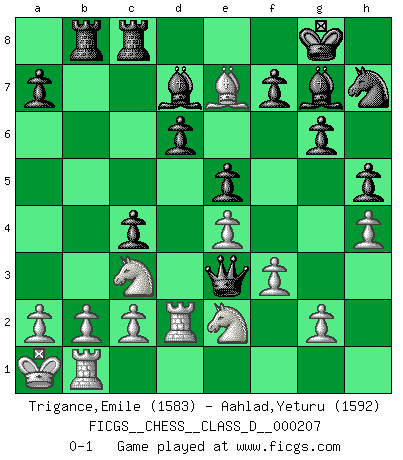 Last move : 0-1 2014 August 22 8:6:53 [Event "FICGS__CHESS__CLASS_D__000207"] [Site "FICGS"] [Date "2014.05.10"] [Round "1"] [White "Trigance,Emile"] [Black "Aahlad,Yeturu"] [Result "0-1"] [WhiteElo "1583"] [BlackElo "1592"] 1.e4 c5 2.Nf3 d6 3.d4 cxd4 4.Nxd4 Nf6 5.Nc3 g6 6.Be3 Bg7 7.f3 O-O 8.Qd2 Nc6 9.Bc4 Bd7 10.O-O-O Qa5 11.Bb3 Rfc8 12.Kb1 Ne5 13.h4 h5 14.Bg5 e6 15.Qe3 b5 16.Rd2 Rab8 17.Rhd1 Nc4 18.Bxc4 bxc4 19.Ka1 Nh7 20.Be7 Qb6 21.Rb1 e5 22.Nde2 Qxe3 0-1 Sicilian : Dragon, Yugoslav attack, 7...O-O Kingside Castling by player Black (move 7) Queenside Castling by player White (move 10) Player Black won this chess game. Follow this game move after move (download)Chess is like war on a board. (Bobby Fischer) Der Verteidiger gebe der Gewalt nach, aber nur der Gewalt. Er schaffe sich nicht freiwillig, etwa aus Blindheit oder aus Schrecken, irgendwelche Schwächen. Er lasse sich nicht bluffen. (Emanuel Lasker) Solo existe una cosa que Fischer hace en el Ajedrez sin placer: ¡perder!. (Boris Spassky) Des combinaisons [dans le jeu d'échecs] pareilles à des mélodies. Je crois entendre pour ainsi dire la musique des coups... (Vladimir Nabokov) It's not enough to succeed. Others must fail. (Gore Vidal)