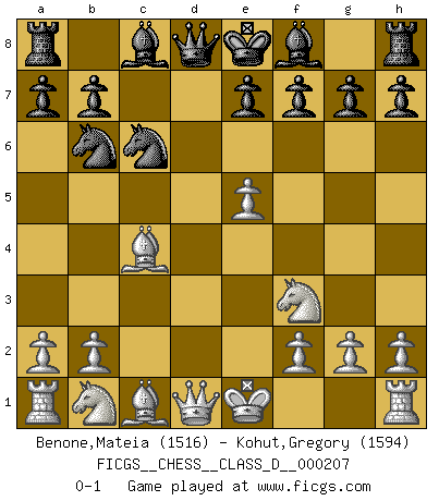 Last move : 0-1 2014 July 11 12:37:56 [Event "FICGS__CHESS__CLASS_D__000207"] [Site "FICGS"] [Date "2014.05.10"] [Round "1"] [White "Benone,Mateia"] [Black "Kohut,Gregory"] [Result "0-1"] [WhiteElo "1516"] [BlackElo "1594"] 1.e4 c5 2.c3 Nf6 3.e5 Nd5 4.d4 cxd4 5.cxd4 d6 6.Nf3 Nc6 7.Bc4 dxe5 8.dxe5 Nb6 0-1 This chess game has been lost on time (started : 2014.05.10 2:2:17) Sicilian : Alapin's variation (2.c3) Player Black won this chess game. Follow this game move after move (download)Bobby is the finest Chess player this country ever produced. His memory for the moves, his brilliance in dreaming up combinations, and his fierce determination to win are uncanny. (John Collins) Schon mancher Spieler hat aufgegeben, um zu vermeiden, daß er eine Figur verliert. (Savielly Grigorievitsch Tartakower) El Ajedrez es tortura mental. (Garry Kasparov) La conception d'un plan est le processus par lequel un joueur exploite les avantages de sa position tout en s'efforçant d'en réduire au minimum les inconvénients. Afin de garantir le succès, un plan doit toujours se fonder sur un diagnostic objectif des particularités d'une position. La conception d'un plan est d'autant plus difficile que la position est équilibrée, et grandement facilitée lorsqu'il n'existe qu'un seul plan susceptible de répondre aux exigences de la position. (Harry Golombek) In God we trust, all others we virus scan. (Anonymous)