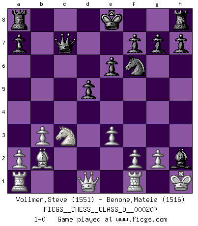 Last move : 1-0 2014 August 5 3:23:42 [Event "FICGS__CHESS__CLASS_D__000207"] [Site "FICGS"] [Date "2014.05.10"] [Round "1"] [White "Vollmer,Steve"] [Black "Benone,Mateia"] [Result "1-0"] [WhiteElo "1551"] [BlackElo "1516"] 1.d4 Nf6 2.c4 e6 3.Nf3 c5 4.Nc3 cxd4 5.Nxd4 Nc6 6.e3 d5 7.Nxc6 bxc6 8.cxd5 cxd5 9.Bb5+ Bd7 10.Bxd7+ Qxd7 11.O-O Bd6 12.b3 Qc7 13.Bb2 Bxh2+ 14.Kh1 1-0 This chess game has been lost on time (started : 2014.05.10 2:2:17) Queen's pawn game Kingside Castling by player White (move 11) Player White won this chess game. Follow this game move after move (download)You know, comrade Pachman, I don't enjoy being a Minister, I would rather play Chess like you. (Che Guevara) Das Zentrum ist der Balkan des Schachbretts - Kriegshandlungen können in jedem Moment ausbrechen. (Aaron Nimzowitsch) Aún el Rey más flojo huye despavorido ante la amenaza de un Jaque doble. (Aaron Nimzowitsch) Vous m'avez demandé de vous exposer quel est le fondement de la prière. Je ne fais que préparer les pièces du jeu sur la table... Nous sera-t-il permis d'en adopter les règles et si nous les appliquons scrupuleusement nous ne tarderons pas à faire mat le Roi divin ! Il ne pourra échapper à nos mains. (Sainte Thérèse d'Avila, Chemin de perfection) Indecision is the key to flexibility. (Unknown)