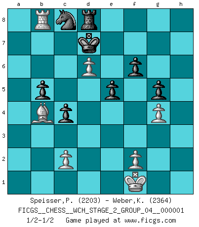 Last move : 1/2-1/2 2007 May 11 23:38:20 [Event "FICGS__CHESS__WCH_STAGE_2_GROUP_04__000001"] [Site "FICGS"] [Date "2007.02.15"] [Round "1"] [White "Speisser,Patrick"] [Black "Weber,Karlheinz"] [Result "1/2-1/2"] [WhiteElo "2203"] [BlackElo "2364"] 1.e4 e6 2.d4 d5 3.Nc3 Bb4 4.e5 c5 5.a3 Bxc3+ 6.bxc3 Ne7 7.Nf3 Qc7 8.Bd3 b6 9.a4 Ba6 10.a5 Bxd3 11.axb6 axb6 12.Rxa8 Ba6 13.Rxa6 Nxa6 14.O-O Nb8 15.c4 dxc4 16.dxc5 Qxc5 17.Be3 Qc6 18.Qd4 Nd7 19.Qd6 Qxd6 20.exd6 Nc8 21.Ra1 f6 22.Nd2 Kf7 23.Ra8 b5 24.Ne4 Rd8 25.Kf1 e5 26.g4 Ke6 27.Nc5+ Nxc5 28.Bxc5 Kd7 29.Rb8 g6 30.Bb4 h5 31.h3 hxg4 32.hxg4 g5 1/2-1/2 French : Winawer, Advance, positional Main line Kingside Castling by player White (move 14) This chess game ended in a draw. Follow this game move after move (download)Whoever sees no other aim in the game than that of giving checkmate to one's opponent will never become a good Chess player. (Euwe) Die Leute spielen gegen mich seit 15 Jahren unter Ihren Möglichkeiten. (Robert James Fischer) El Ajedrez es de 30 a 40 por ciento psicología. Uno no cuenta con esto cuando se juega contra una computadora. No lo puedo confundir. (Judith Polgar) Que feriez-vous si vous étiez en train de jouer aux échecs et que la fin du monde arrive ? Je continuerais à jouer. (Saint Borromée) Do not put your faith in what statistics say until you have carefully considered what they do not say. (William W. Watt)