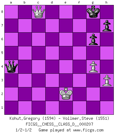 Last move : 1/2-1/2 2015 April 25 14:34:37 [Event "FICGS__CHESS__CLASS_D__000207"] [Site "FICGS"] [Date "2014.05.10"] [Round "1"] [White "Kohut,Gregory"] [Black "Vollmer,Steve"] [Result "1/2-1/2"] [WhiteElo "1594"] [BlackElo "1551"] 1.e4 e5 2.Nf3 Nc6 3.Bb5 a6 4.Ba4 Nf6 5.O-O b5 6.Bb3 Be7 7.Re1 O-O 8.c3 d6 9.h3 Na5 10.Bc2 c5 11.d4 cxd4 12.cxd4 Nc6 13.Be3 Bb7 14.Nc3 Rc8 15.Rc1 exd4 16.Bxd4 Nxd4 17.Qxd4 Rc5 18.Bb3 Nd7 19.Nd5 Bxd5 20.Bxd5 Bf6 21.Qd2 Nb6 22.Bb3 Nc4 23.Bxc4 bxc4 24.Red1 Be7 25.Qe2 Qc7 26.Rc2 Rc8 27.Rdc1 Bf6 28.Nd2 Bg5 29.Rxc4 Qe7 30.Rxc5 dxc5 31.Re1 Qe6 32.b3 Bxd2 33.Qxd2 c4 34.bxc4 Qxc4 35.f3 g6 36.Kf2 Qa4 37.Re2 Kg7 38.e5 Qc4 39.f4 a5 40.g3 a4 41.Qe3 Rc6 42.g4 Qe6 43.Rd2 f6 44.exf6+ Kxf6 45.Qd4+ Kf7 46.Qa7+ Qe7 47.Qxa4 Rd6 48.Rxd6 Qxd6 49.Qc4+ Kg7 50.Qc3+ Kg8 51.Qc4+ Kg7 52.Qc3+ Kg8 53.a4 Qxf4+ 54.Ke2 Qxa4 55.Qc8+ 1/2-1/2 Ruy Lopez : 5.O-O Kingside Castling by player White (move 5) Kingside Castling by player Black (move 7) 10 pieces endgame at move 48 : White KQPPPP , Black KQPP WHITE : King + 1 Queen 4 Pawns BLACK : King + 1 Queen 2 Pawns 9 pieces endgame at move 53 : White KQPPP , Black KQPP WHITE : King + 1 Queen 3 Pawns BLACK : King + 1 Queen 2 Pawns 8 pieces endgame at move 54 : White KQPP , Black KQPP WHITE : King + 1 Queen 2 Pawns BLACK : King + 1 Queen 2 Pawns This chess game ended in a draw. Follow this game move after move (download)First-class players lose to second class players because second-class players sometimes play a first-class game. (Tarrasch) Der Schachmeister von Heute braucht Courage, einen Killerinstinkt, Ausdauer und Arroganz. (Larry Evans) De todos mis libros Rusos, la defensa contiene y difunde el 'calor' mas grande que pudiese verse extraño al observar lo supremamente abstracto que el Ajedrez supuestamente es. (Vladimir Nabokov) Les Echecs sont affaire de jugement sensible. Savoir quand frapper et quand esquiver. (Fischer) Warrior pose battles inner weakness and wins focus. You see that there is no war within you. You're on your own side, and you are your own strength. (Terri Guillemets)