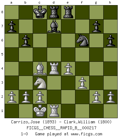 Last move : 1-0 2014 June 29 17:13:1 [Event "FICGS__CHESS__RAPID_B__000217"] [Site "FICGS"] [Date "2014.05.10"] [Round "1"] [White "Carrizo,Jose"] [Black "Clark,William"] [Result "1-0"] [WhiteElo "1893"] [BlackElo "1800"] 1.e4 c5 2.Nf3 d6 3.d4 cxd4 4.Nxd4 Nc6 5.Nc3 Nf6 6.Bg5 Bg4 7.f3 Bd7 8.Qd2 e5 9.Ndb5 Be7 10.Nxd6+ Bxd6 11.Qxd6 Qe7 12.Qxe7+ Nxe7 13.O-O-O O-O-O 14.Bc4 h6 15.Be3 b6 16.Bxf7 Nc6 17.Rd2 Be8 18.Be6+ Bd7 19.Bc4 Rhe8 20.Rhd1 Nd4 21.Bxd4 exd4 22.Rxd4 1-0 Sicilian Queenside Castling by player White (move 13) Queenside Castling by player Black (move 13) Player White won this chess game. Follow this game move after move (download)Pawns: they are the soul of this game, they alone form the attack and defense. (Philidor) Schachspieler können ausgezeichnet Varianten am Schachbrett berechnen, aber nicht im realen Leben. Zu stark ist der Individualismus im Schach ausgeprägt, und für viele ist ein kleiner momentaner persönlicher Vorteil wichtiger als ein weit größerer Vorteil von morgen. (Anatoly Karpov) Antes de los Finales, los dioses han colocado el Juego Medio. (Siegbert Tarrasch) Donnez-moi un Cavalier en 6e et je gagnerais toutes mes parties. (Steinitz) Hold em is to stud what chess is to checkers. (Johnny Moss)