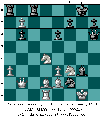 Last move : 0-1 2014 July 23 14:55:21 [Event "FICGS__CHESS__RAPID_B__000217"] [Site "FICGS"] [Date "2014.05.10"] [Round "1"] [White "Kepinski,Janusz"] [Black "Carrizo,Jose"] [Result "0-1"] [WhiteElo "1769"] [BlackElo "1893"] 1.d4 d5 2.c4 e6 3.Nc3 c6 4.e3 Nf6 5.Nf3 Nbd7 6.Qc2 Bd6 7.Bd2 O-O 8.Bd3 dxc4 9.Bxc4 c5 10.O-O b6 11.Nb5 Bb8 12.dxc5 Nxc5 13.b4 Nce4 14.Rad1 Bb7 15.a3 a6 16.Nbd4 Qd6 17.Be2 g5 18.h3 Rc8 19.Qb2 g4 20.hxg4 Nxg4 21.b5 Qf8 22.bxa6 Qh6 23.g3 Bxg3 24.axb7 Ngxf2 25.Rxf2 Nxf2 0-1 QGD : Semi-Slav Kingside Castling by player Black (move 7) Kingside Castling by player White (move 10) Player Black won this chess game. Follow this game move after move (download)The most important feature of the Chess position is the activity of the pieces. This is absolutely fundamental in all phases of the game: Opening, Middlegame and especially Endgame. The primary constraint on a piece's activity is the Pawn structure. (Michael Stean) Kleine Schachspieler machen Mist, und große Schachspieler machen Mist, aber große machen weniger Mist. (Fritz Sämisch) Una clavada es mas poderosa que una espada. (Fred Reinfeld) Il vaut toujours mieux jouer un plan faux de façon logique que de n'avoir pas de plan du tout. (Victor Kortchnoï) Experience is the name we all give to our mistakes. (Oscar Wilde)