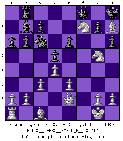 Last move : 1-0 2014 May 29 23:58:25 [Event "FICGS__CHESS__RAPID_B__000217"] [Site "FICGS"] [Date "2014.05.10"] [Round "1"] [White "Voudouris,Nick"] [Black "Clark,William"] [Result "1-0"] [WhiteElo "1707"] [BlackElo "1800"] 1.d4 Nf6 2.f4 e6 3.Nf3 b6 4.e3 Bb7 5.Bd3 Be7 6.O-O O-O 7.Qe2 d5 8.Nbd2 a6 9.f5 Nc6 10.fxe6 fxe6 11.c3 Bd6 12.Ng5 Ne4 13.Rxf8+ Qxf8 14.Ndxe4 h6 15.Nxd6 Rb8 16.Bh7+ Kh8 17.Ndf7+ 1-0 Canard Opening Kingside Castling by player White (move 6) Kingside Castling by player Black (move 6) Player White won this chess game. Follow this game move after move (download)There are two classes of men; those who are content to yield to circumstances and who play whist; those who aim to control circumstances, and who play Chess. (Mortimer Collins) Was ist der Unterschied zwischen einem Strassenarbeiter und einem Schachspieler? --Der Schachspieler bewegt sich ab und zu. (Anonymous) Entre mas años cumplo, mas valoro los Peones. (Keres) Je ne suis pas le dernier à jouer lâchement des coups douteux pendant le zeïtnot de l'adversaire pour l'achever: en effet les coups qui font le plus peur sont ceux que l'on ne comprend pas. Je me fais souvent peur quand je joue. (Un professeur anonyme) Life is painting a picture, not doing a sum. (Oliver Wendell Holmes, Jr.)
