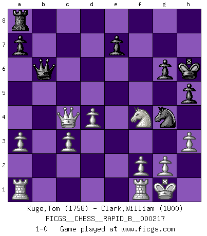 Last move : 1-0 2014 May 13 23:15:2 [Event "FICGS__CHESS__RAPID_B__000217"] [Site "FICGS"] [Date "2014.05.10"] [Round "1"] [White "Kuge,Tom"] [Black "Clark,William"] [Result "1-0"] [WhiteElo "1758"] [BlackElo "1800"] 1.e4 c5 2.a3 d6 3.b4 Nf6 4.Nc3 b6 5.Bc4 Be6 6.Bxe6 fxe6 7.e5 dxe5 8.bxc5 bxc5 9.Nf3 e4 10.Ng5 Qb6 11.O-O Nc6 12.Ngxe4 Nxe4 13.Nxe4 g6 14.c3 Bh6 15.d3 Bxc1 16.Qxc1 Ne5 17.Qe3 c4 18.d4 Ng4 19.Qe2 h5 20.Qxc4 O-O 21.h3 Rf4 22.Nc5 Kg7 23.Nxe6+ Kh6 24.Nxf4 1-0 Sicilian defense Kingside Castling by player White (move 11) Kingside Castling by player Black (move 20) Player White won this chess game. Follow this game move after move (download)It's always better to sacrifice your opponent's men. (Savielly Tartakover) Ich tröste mich mit dem Vergnügen, daß Schachfans, Zuschauer und Leser glücklich sind, wenn ein Großmeister etwas riskiert, statt nur Klötzchen zu schieben. (Mikhail Nekhemyevich Tal) Muchos se han convertido en Maestros de Ajedrez, nadie se ha convertido en el Maestro del Ajedrez. (Siegbert Tarrasch) Horreur, mais aussi harmonie suprême : qu'y avait-il en effet au monde en dehors des échecs ? Le brouillard, l'inconnu, le non-être... (Vladimir Nabokov) True nature is revealed in times of difficulty. (Chinese proverb)