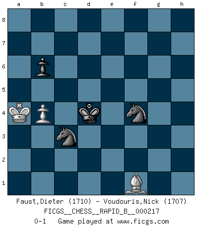 Last move : 0-1 2014 September 9 16:0:28 [Event "FICGS__CHESS__RAPID_B__000217"] [Site "FICGS"] [Date "2014.05.10"] [Round "1"] [White "Faust,Dieter"] [Black "Voudouris,Nick"] [Result "0-1"] [WhiteElo "1710"] [BlackElo "1707"] 1.d4 d5 2.c4 e6 3.Nf3 c6 4.Qc2 Bd6 5.Bg5 f6 6.Bh4 g5 7.Bg3 Ne7 8.e3 h5 9.c5 Bc7 10.Nc3 Nd7 11.O-O-O b6 12.Bd6 Bxd6 13.cxd6 Nf5 14.Ne2 Nf8 15.Ng3 Qxd6 16.e4 Ne7 17.h4 Qf4+ 18.Kb1 g4 19.Ne1 Nfg6 20.Nd3 Qd6 21.Qa4 Bd7 22.Be2 f5 23.e5 Qc7 24.Qa3 a5 25.Rc1 f4 26.Nxh5 Rxh5 27.Bxg4 Rxh4 28.Rxh4 Nxh4 29.Rh1 Nhg6 30.Nxf4 O-O-O 31.Nxe6 Bxe6 32.Bxe6+ Kb7 33.Rh7 Rh8 34.Rxh8 Nxh8 35.f4 Nhg6 36.Qf3 Nf8 37.Bh3 c5 38.f5 cxd4 39.f6 Nc6 40.Qxd5 d3 41.Bf5 d2 42.Qxd2 Qxe5 43.Qf2 Kc7 44.Bh3 Nb4 45.b3 Qe4+ 46.Ka1 Nd3 47.Qg3+ Kc6 48.Qf3 Qxf3 49.gxf3 Kd6 50.Bf1 Ne5 51.f4 Ng4 52.f7 Ne3 53.Ba6 Nd5 54.Kb2 Nxf4 55.Kc3 Kc5 56.a3 Nd5+ 57.Kd3 Nf6 58.b4+ axb4 59.axb4+ Kd6 60.Kd4 Ne6+ 61.Kc4 Nd5 62.Bb7 Ndc7 63.Bc8 Nf8 64.Bb7 Ke6 65.Bf3 Kxf7 66.Kd4 Kf6 67.Bd1 Kf5 68.Bc2+ Kf4 69.Bd1 Nd7 70.Be2 Nb8 71.Bf1 Nc6+ 72.Kc4 Ke3 73.Kc3 Ne5 74.Bg2 Nb5+ 75.Kc2 Kd4 76.Kb3 Nc3 77.Bf1 Nd3 78.Bg2 Nd5 79.Ka4 N3f4 80.Bf1 Nc3+ 0-1 Queen's gambit declined Queenside Castling by player White (move 11) Queenside Castling by player Black (move 30) 10 pieces endgame at move 54 : White KBPPP , Black KNNPP WHITE : King + 1 Bishop 3 Pawns BLACK : King + 2 Knights 2 Pawns 9 pieces endgame at move 58 : White KBPP , Black KNNPP WHITE : King + 1 Bishop 2 Pawns BLACK : King + 2 Knights 2 Pawns 8 pieces endgame at move 59 : White KBPP , Black KNNP WHITE : King + 1 Bishop 2 Pawns BLACK : King + 2 Knights 1 Pawn 7 pieces endgame at move 65 : White KBP , Black KNNP WHITE : King + 1 Bishop 1 Pawn BLACK : King + 2 Knights 1 Pawn Player Black won this chess game. Follow this game move after move (download)War is the child of passion, passion is the child of narcissism and narcissism is the child. (...) Another game ? (Thibault de Vassal) Obwohl ich alt bin, darf mir niemand den Finger in den Mund stecken, sonst beisse ich. (Wilhelm Steinitz) Aquel que toma al Peón de Caballo de la Reina, se pasará la noche a dormir en la calle. (Anónimo) Avec des compensations pour le matériel en plus... (Anonyme) Man is reluctant to give credit for intelligence to anyone, except his enemies. (Albert Einstein)