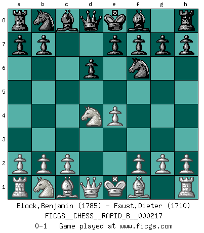 Last move : 0-1 2014 July 15 13:8:12 [Event "FICGS__CHESS__RAPID_B__000217"] [Site "FICGS"] [Date "2014.05.10"] [Round "1"] [White "Block,Benjamin"] [Black "Faust,Dieter"] [Result "0-1"] [WhiteElo "1785"] [BlackElo "1710"] 1.e4 c5 2.Nf3 d6 3.d4 cxd4 4.Nxd4 Nf6 0-1 This chess game has been lost on time (started : 2014.05.10 9:35:14) Sicilian Player Black won this chess game. Follow this game move after move (download)All Chess players should have a hobby. (Savielly Tartakower) Schach verlangt totale Konzentration. (Robert James Fischer) Siempre es mucho mejor sacrificar las piezas de tu oponente. (Savielly Tartakover) La conception d'un plan est le processus par lequel un joueur exploite les avantages de sa position tout en s'efforçant d'en réduire au minimum les inconvénients. Afin de garantir le succès, un plan doit toujours se fonder sur un diagnostic objectif des particularités d'une position. La conception d'un plan est d'autant plus difficile que la position est équilibrée, et grandement facilitée lorsqu'il n'existe qu'un seul plan susceptible de répondre aux exigences de la position. (Harry Golombek) Creativity involves breaking out of established patterns in order to look at things in a different way. (Edward De Bono)