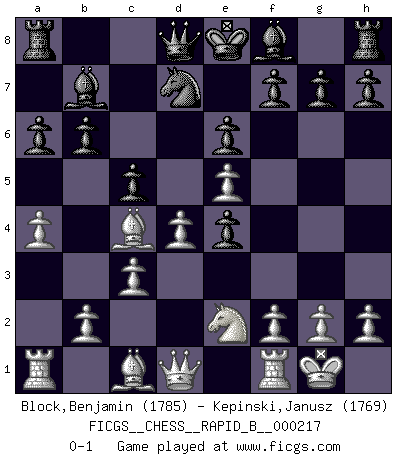 Last move : 0-1 2014 July 12 12:45:5 [Event "FICGS__CHESS__RAPID_B__000217"] [Site "FICGS"] [Date "2014.05.10"] [Round "1"] [White "Block,Benjamin"] [Black "Kepinski,Janusz"] [Result "0-1"] [WhiteElo "1785"] [BlackElo "1769"] 1.e4 e6 2.d4 d5 3.Nc3 Nf6 4.e5 Ne4 5.Nxe4 dxe4 6.Bc4 a6 7.a4 Nd7 8.Ne2 c5 9.c3 b6 10.O-O Bb7 0-1 This chess game has been lost on time (started : 2014.05.10 9:35:14) French : Steinitz variation Kingside Castling by player White (move 10) Player Black won this chess game. Follow this game move after move (download)If cunning alone were needed to excel, women would be the best Chess players. (Albin) Es gibt nur zwei wahre Schachgenies - das andere war Wilhelm Steinitz, der Weltmeister von 1872 bis 1894. (Robert James Fischer) El juego del Ajedrez no es solamente una diversión quieta; algunas cualidades muy valuables de la mente se pueden adquirir y cultivar con el, como convertirlos en habitos disponibles para toda ocasión; ya que la vida es algo así como el Ajedrez. (Benjamin Franklin) Assurément je connaissais par expérience le mystérieux attrait de ce jeu royal, le seul entre tous les jeux inventés par les hommes qui échappe souverainement à la tyrannie du hasard, le seul où l'on ne doive sa victoire qu'à son intelligence ou plutôt à une certaine forme d'intelligence. Mais n'est-ce pas déjà le limiter injurieusement que d'appeler les échecs un jeu ? N'est-ce pas une science, un art ou quelque chose qui, comme le cercueil de Mahomet entre ciel et terre, est suspendu entre l'un et l'autre, et qui réunit un nombre incroyable de contraires ? [...] C'est une pensée qui ne mène à rien, une mathématique qui n'établit rien, un art qui ne laisse pas d'uvre, une architecture sans matière; et il l'a prouvé néanmoins qu'il était plus durable, à sa manière, que les livres ou que tout autre monument, ce jeu unique qui appartient à tous les peuples et à tous les temps, et dont personne ne sait quel dieu en fit don à la terre pour tuer l'ennui, pour aiguiser l'esprit et stimuler l'âme. Où commence-t-il, où finit-il ? (Stefan Zweig) I'm extremely disappointed. I send you out for exciting, new designer drugs, you come back with tomato sauce. (Gregory House, House M.D.)