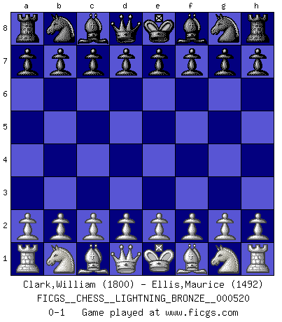 Last move : 0-1 2014 May 10 21:16:13 [Event "FICGS__CHESS__LIGHTNING_BRONZE__000520"] [Site "FICGS"] [Date "2014.05.10"] [Round "1"] [White "Clark,William"] [Black "Ellis,Maurice"] [Result "0-1"] [WhiteElo "1800"] [BlackElo "1492"] 0-1 This chess game has been lost on time (started : 2014.05.10 19:18:17) Player Black won this chess game. Follow this game move after move (download)Only the player with the initiative has the right to attack. (Wilhelm Steinitz) Es gibt keine einzige Frau, der ich nicht einen Springer vorgeben könnte und trotzdem gewänne. (Robert James Fischer) Vive, pierde y aprende al observar a tu oponente como ganar. (Amber Steenbock) Les Echecs ont trois composantes : le temps, l'espace et le matériel en dernier. (Mikhail Tal) Patience, use the Force, think ! (Obi-Wan Kenobi in Star Wars ep.2)