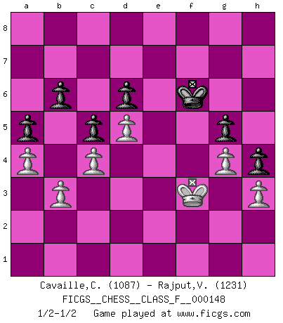 Last move : 1/2-1/2 2014 June 14 20:44:12 [Event "FICGS__CHESS__CLASS_F__000148"] [Site "FICGS"] [Date "2014.05.14"] [Round "1"] [White "Cavaille,Cedric"] [Black "Rajput,Vishalsingh"] [Result "1/2-1/2"] [WhiteElo "1087"] [BlackElo "1231"] 1.e4 e5 2.Nf3 Nc6 3.Bb5 Nge7 4.d4 exd4 5.Bxc6 Nxc6 6.Nxd4 Nxd4 7.Qxd4 c5 8.Qe5+ Qe7 9.Qxe7+ Bxe7 10.Nc3 O-O 11.O-O Bd8 12.Be3 b6 13.Nd5 Bb7 14.b3 Bxd5 15.exd5 d6 16.c4 Bf6 17.Rae1 Bc3 18.Rd1 h6 19.Rd3 Bf6 20.Bf4 Rad8 21.a3 g5 22.Bd2 Rfe8 23.Re1 Bd4 24.Rxe8+ Rxe8 25.Be3 Bf6 26.h3 Be5 27.g4 Kg7 28.Kg2 Kg6 29.Rd1 h5 30.f3 h4 31.Rf1 f6 32.f4 Bb2 33.Bc1 Bc3 34.fxg5 fxg5 35.Kf3 a5 36.a4 Re5 37.Rf2 Re1 38.Bd2 Bxd2 39.Rxd2 Kf6 40.Re2 Rxe2 41.Kxe2 Ke5 42.Ke3 Kf6 43.Ke4 Kg6 44.Kf3 Kf6 45.Ke4 Kg6 46.Kf3 Kf6 1/2-1/2 Ruy Lopez : Cozio defense Kingside Castling by player Black (move 10) Kingside Castling by player White (move 11) This chess game ended in a draw. Follow this game move after move (download)Chess is everything: art, science and sport. (Anatoly Karpov) Ich spiele ehrlich und spiele, um zu gewinnen. Wenn ich verliere nehme ich meine Medizin. (Robert James Fischer) Los asuntos humanos son como una partida de Ajedrez: solo aquellos que no lo toman seriamente, pueden ser llamados buenos jugadores. (Hung Tzu Ch'eng) J'ai vu le vaincu d'Echecs jouer des années durant dans l'espoir de la fête de la victoire. Car tu es plus riche de ce qu'elle existe si même elle n'est point pour toi. Ainsi de la perle du fond des mers. (Antoine de Saint-Exupéry) Establishing goals is all right if you don't let them deprive you of interesting detours. (Doug Larson)