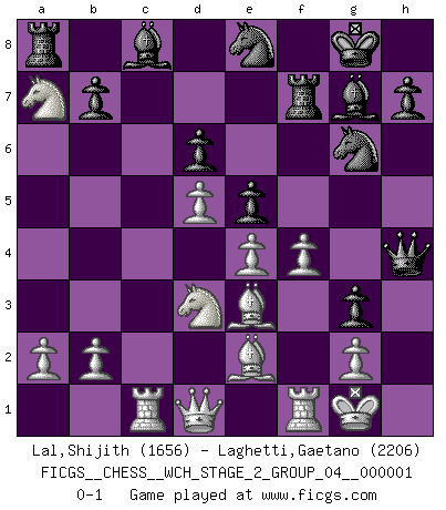 Last move : 0-1 2007 April 19 4:13:58 [Event "FICGS__CHESS__WCH_STAGE_2_GROUP_04__000001"] [Site "FICGS"] [Date "2007.02.15"] [Round "1"] [White "Lal,Shijith"] [Black "Laghetti,Gaetano"] [Result "0-1"] [WhiteElo "1656"] [BlackElo "2206"] 1.d4 Nf6 2.Nf3 g6 3.c4 Bg7 4.Nc3 O-O 5.e4 d6 6.Be2 e5 7.O-O Nc6 8.d5 Ne7 9.Ne1 Nd7 10.Be3 f5 11.f3 f4 12.Bf2 g5 13.Nd3 Nf6 14.c5 Ng6 15.Rc1 Rf7 16.cxd6 cxd6 17.Nb5 g4 18.Nxa7 g3 19.hxg3 fxg3 20.Be3 Ne8 21.f4 Qh4 0-1 King's Indian : East Indian defense Kingside Castling by player Black (move 4) Kingside Castling by player White (move 7) Player Black won this chess game. Follow this game move after move (download)In blitz, the Knight is stronger than the Bishop. (Vlastimil Hort) Im Leben werden Partien nie so unstrittig gewonnen wie im Spiel (Emanuel Lasker) El Ajedrez es un terrible juego. Si no controlas el centro, tu oponente tiene una posición mas holgada. Si tienes control del centro, ¡entonces realmente tu tienes algo de que preocuparte!. (Siegbert Tarrasch) Le système Elo représente seulement une moyenne. Il est simplement un indicateur de votre stabilité. (Anatoli Karpov) I can't decide which is riskier; taking crazy risks, or taking advice on crazy risks from a crazy risk taker. (Gregory House in House M.D.)