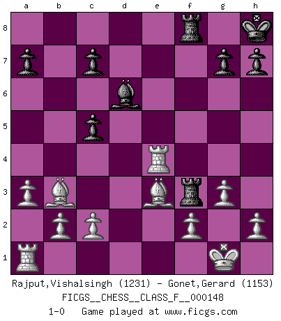 Last move : 1-0 2014 May 17 16:22:14 [Event "FICGS__CHESS__CLASS_F__000148"] [Site "FICGS"] [Date "2014.05.14"] [Round "1"] [White "Rajput,Vishalsingh"] [Black "Gonet,Gerard"] [Result "1-0"] [WhiteElo "1231"] [BlackElo "1153"] 1.e4 e5 2.Nf3 f5 3.exf5 e4 4.Ng1 d5 5.a3 Bxf5 6.d3 Nf6 7.Nc3 Bd6 8.Nge2 O-O 9.Nd4 Bd7 10.dxe4 Nxe4 11.Nxe4 dxe4 12.Bc4+ Kh8 13.O-O Nc6 14.Bd5 Qh4 15.g3 Qe7 16.Nxc6 bxc6 17.Bb3 Bh3 18.Re1 Qf6 19.Be3 Qf3 20.Qxf3 Rxf3 21.Bd4 Raf8 22.Rxe4 c5 23.Be3 Bf5 24.Ra4 Be4 25.Rxe4 1-0 Latvian counter-gambit Kingside Castling by player Black (move 8) Kingside Castling by player White (move 13) Player White won this chess game. Follow this game move after move (download)White lost because he failed to remember the right continuation and had to think up the moves himself. (Siegbert Tarrasch) Wenn du nicht weißt was du tun sollst, warte bis dein Gegner eine Idee hat. Sie wird sicher schlecht sein. (Siegbert Tarrasch) El Ajedrez es parte de una cultura y si una cultura esta en decadencia, entonces también el Ajedrez declinará. (Mikhail Botvinnik) Aux échecs, l'amour-propre est satisfait quand on remporte la victoire, mais il n'y a pas de honte à être battu. (Benjamin Franklin) All the troubles of the world come from being unable to sit alone in a quiet room. (Blaise Pascal)