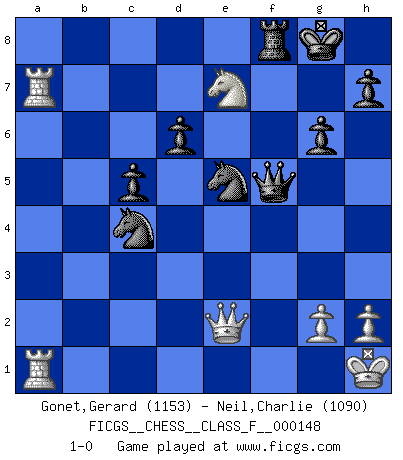 Last move : 1-0 2014 May 25 14:50:25 [Event "FICGS__CHESS__CLASS_F__000148"] [Site "FICGS"] [Date "2014.05.14"] [Round "1"] [White "Gonet,Gerard"] [Black "Neil,Charlie"] [Result "1-0"] [WhiteElo "1153"] [BlackElo "1090"] 1.d4 Nf6 2.c4 c5 3.d5 b5 4.cxb5 a6 5.Nc3 d6 6.e4 g6 7.f4 Bg7 8.Nf3 Nbd7 9.a4 axb5 10.Bxb5 O-O 11.Bd2 Ba6 12.O-O Bxb5 13.Nxb5 Nxe4 14.Be1 Nef6 15.a5 Nb8 16.Qa4 Na6 17.Nd2 Nxd5 18.Nc4 Ndb4 19.Nb6 Rb8 20.Rd1 Rxb6 21.axb6 Qxb6 22.Bc3 Bxc3 23.bxc3 Nc6 24.Rb1 Nc7 25.Kh1 Qa5 26.Qc4 Qa6 27.f5 Ne5 28.Qe2 Nd5 29.c4 Nb6 30.Ra1 Qc8 31.fxg6 fxg6 32.Rfc1 Qd7 33.Ra7 Qe6 34.Nc7 Qd7 35.Rca1 Nbxc4 36.Nd5 Qf5 37.Nxe7+ 1-0 Benko gambit : Zaitsev system Kingside Castling by player Black (move 10) Kingside Castling by player White (move 12) Player White won this chess game. Follow this game move after move (download)Don't even mention losing to me. I can't stand to think of it. (Bobby Fischer) Rauchen ist dem Schachspieler bei seiner Arbeit, also im Wettkampf, untersagt. (Viktor Kortschnoi) El Ajedrez lo es todo: arte, ciencia y deporte. (Anatoly Karpov) Les pièces de l'échiquier étaient impitoyables. Elles le retenaient, elles l'absorbaient. Il y avait de l'horreur en cela, mais aussi une harmonie unique. Car, qu'y a-t-il dans le monde, à part les échecs ? (V. Nabokov) Kids, you tried your best and you failed miserably. The lesson is, never try. (Simpsons)