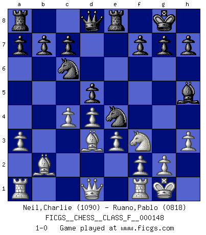 Last move : 1-0 2014 August 5 3:23:42 [Event "FICGS__CHESS__CLASS_F__000148"] [Site "FICGS"] [Date "2014.05.14"] [Round "1"] [White "Neil,Charlie"] [Black "Ruano,Pablo"] [Result "1-0"] [WhiteElo "1090"] [BlackElo "0818"] 1.Nf3 d5 2.d4 Nc6 3.c4 Nf6 4.Nc3 e6 5.e3 Bb4 6.a3 Bxc3+ 7.bxc3 O-O 8.cxd5 exd5 9.Bd3 Bg4 10.h3 Bh5 11.c4 Re8 12.O-O Ne4 13.Bb2 1-0 Reti Opening Kingside Castling by player Black (move 7) Kingside Castling by player White (move 12) Player White won this chess game. Follow this game move after move (download)I played Chess with him and would have beaten him sometimes only he always took back his last move, and ran the game out differently. (Mark Twain) Wenn ich gewinne bin ich ein Genie. Wenn nicht, dann bin ich keines. (Robert James Fischer) Siempre es mejor sacrificar los hombres de tu oponente. (Savielly Tartakower) Votre seul travail dans les ouvertures est d'obtenir un milieu de partie jouable. (Lajos Portish) It's not the will to win, but the will to prepare to win that makes the difference. (Bear Bryant)