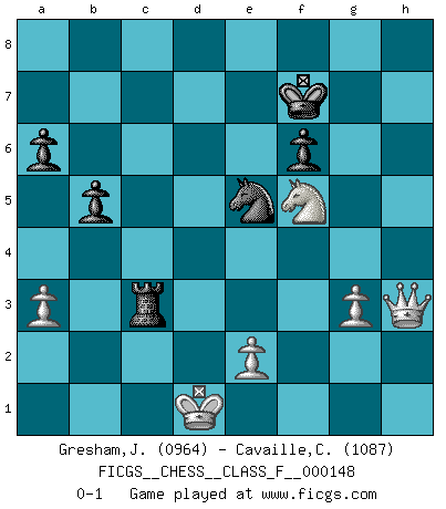 Last move : 0-1 2014 August 28 18:2:54 [Event "FICGS__CHESS__CLASS_F__000148"] [Site "FICGS"] [Date "2014.05.14"] [Round "1"] [White "Gresham,Jonathan"] [Black "Cavaille,Cedric"] [Result "0-1"] [WhiteElo "0964"] [BlackElo "1087"] 1.Nf3 c5 2.g3 d5 3.d4 cxd4 4.Qxd4 e6 5.Bd2 Nf6 6.Nc3 Nc6 7.Qa4 Be7 8.Bg2 O-O 9.O-O-O Bb4 10.Nb1 Bxd2+ 11.Nbxd2 a6 12.h4 Qa5 13.Qb3 Nb4 14.a3 Nc6 15.c3 b5 16.Qc2 Bb7 17.Ng5 Ne5 18.Nb3 Qb6 19.f3 h6 20.Nd4 hxg5 21.hxg5 Ng6 22.gxf6 gxf6 23.Bh3 Kg7 24.f4 Rh8 25.f5 Ne5 26.fxe6 fxe6 27.Nxe6+ Kf7 28.Bf5 Rxh1 29.Rxh1 Bc8 30.Rh7+ Kg8 31.Rg7+ Kh8 32.Bh3 Qe3+ 33.Kd1 Qh6 34.Bf5 Qxg7 35.Nxg7 Bxf5 36.Nxf5 Rc8 37.Nh4 d4 38.Qf5 Rc6 39.Qh5+ Kg7 40.Nf5+ Kf8 41.Qh8+ Kf7 42.Qh3 dxc3 43.bxc3 Rxc3 0-1 Reti Opening Kingside Castling by player Black (move 8) Queenside Castling by player White (move 9) Player Black won this chess game. Follow this game move after move (download)I love all positions. Give me a difficult positional game, I will play it. But totally won positions, I cannot stand them. (Hein Donner) Ich trinke, ich rauche, ich spiele, ich liebe Frauen aber Fernschach ist ein Laster, das ich nicht habe. (Mikhail Nekhemyevich Tal) Un mal día en el Ajedrez, es mejor que cualquier buen día en el trabajo. (Anonymous) Les échecs c'est le défi de l'alpiniste, toujours plus haut, prêt à tout pour monter à l'assaut du Roi ennemi. Les échecs, c'est de la musique en mouvement, un ballet majestueux pour les yeux. C'est de la poésie composée par les fantômes du passé qui au même titre que Rimbaud ou Verlaine méritent notre admiration. Les échecs, c'est de la peinture ou le moindre mouvement modifie le tableau pour en faire un Picasso ou un Van Gogh. Les échecs, c'est tout et rien, c'est la vie et la mort. Jjulie33 sur le forum de France-Echecs. Computers have lots of memory but no imagination. (Anonymous)