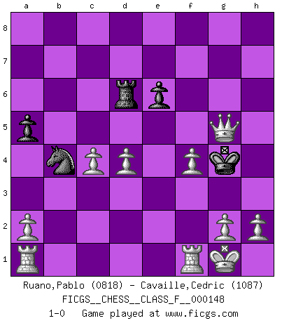 Last move : 1-0 2014 May 30 15:57:42 [Event "FICGS__CHESS__CLASS_F__000148"] [Site "FICGS"] [Date "2014.05.14"] [Round "1"] [White "Ruano,Pablo"] [Black "Cavaille,Cedric"] [Result "1-0"] [WhiteElo "0818"] [BlackElo "1087"] 1.d4 d5 2.c4 dxc4 3.Nc3 e6 4.e4 Qd7 5.Bxc4 Bb4 6.Nf3 Bxc3+ 7.bxc3 Nf6 8.e5 Nd5 9.Bd2 h6 10.O-O O-O 11.Nh4 a6 12.Qg4 Kh8 13.Bd3 f6 14.Ng6+ Kg8 15.Nxf8 Kxf8 16.exf6 gxf6 17.Bxh6+ Ke7 18.c4 Nb4 19.Qg7+ Kd8 20.Qxf6+ Qe7 21.Qh8+ Kd7 22.Bf8 Nxd3 23.Bxe7 Kxe7 24.Qxc8 a5 25.Qxc7+ Kf6 26.Qxb7 Ra6 27.Qxb8 Nb4 28.Qf8+ Kg5 29.f4+ Kg4 30.Qf6 Rd6 31.Qg5+ 1-0 Queen's gambit accepted Kingside Castling by player White (move 10) Kingside Castling by player Black (move 10) Player White won this chess game. Follow this game move after move (download)A big shock; the best chess player in history has passed away. (Lajos Portisch, about Bobby Fischer's death) Karpov ist ein Museumsstück. (Garry Kasparov) El tablero es el mundo, las piezas es el fenomeno del universo, las reglas del juego son lo que llamamos leyes de la naturaleza y el jugador del lado opuesto, se encuentra oculto a nuestra vista. (Thomas Huxley) Les échecs, c'est la lutte contre l'erreur. (Johannes Zukertort) Chess, like love, like music, has the power to make people happy. (Siegbert Tarrasch)