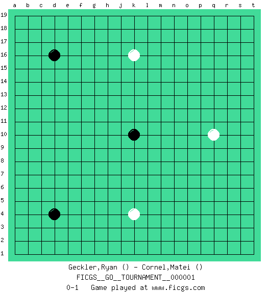 Last move : 0-1 2006 June 29 12:16:31 [Event "FICGS__GO__TOURNAMENT__000001"] [Site "FICGS"] [Date "2006.05.26"] [Round "1"] [Black "Geckler,Ryan"] [White "Cornel,Matei"] [Result "0-1"] 1.k10 k4 2.d16 q10 3.d4 k16 0-1 This go game has been lost on time (started : 2006.05.26 10:47:39) Here are the names of the openings (joseki) played in the four corners : Player White won this Go (weiqi, baduk) game. Follow this game move after move (download)Ikken tobi is never wrong. (Anonymous) Mac users swear by their computers. PC users swear at their computers. (Author unknown)