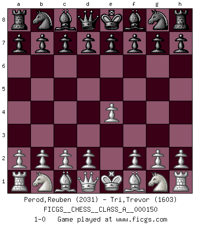 Last move : 1-0 2014 June 29 12:7:9 [Event "FICGS__CHESS__CLASS_A__000150"] [Site "FICGS"] [Date "2014.05.17"] [Round "1"] [White "Perod,Reuben"] [Black "Tri,Trevor"] [Result "1-0"] [WhiteElo "2031"] [BlackElo "1603"] 1.e4 1-0 This chess game has been lost on time (started : 2014.05.17 15:6:14) King's pawn Opening Player White won this chess game. Follow this game move after move (download)Bobby is the finest Chess player this country ever produced. His memory for the moves, his brilliance in dreaming up combinations, and his fierce determination to win are uncanny. (John Collins) Schach ist Kampf, hauptsächlich jedoch gegen die eigenen Fehler. (Savielly Grigorievitsch Tartakower) Sin errores no puede haber brillantez. (Emanuel Lasker) Plusieurs personnes se sont demandées comment Tal faisait pour gagner... En fait, c'est très simple ! Il met ses pièces au centre de l'échiquier et les sacrifie quelque part ! (David Bronstein) When you don't know what to do, walk fast and look worried. (Anonymous)