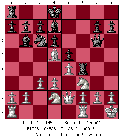 Last move : 1-0 2014 August 12 4:34:51 [Event "FICGS__CHESS__CLASS_A__000150"] [Site "FICGS"] [Date "2014.05.17"] [Round "1"] [White "Meli,Cosimo Leonardo"] [Black "Saher,Caglar"] [Result "1-0"] [WhiteElo "1954"] [BlackElo "2000"] 1.e4 e5 2.Nf3 Nc6 3.Bc4 Nf6 4.Ng5 Bc5 5.Bxf7+ Ke7 6.Bb3 Rf8 7.d3 d6 8.Nf3 Qe8 9.Be3 Bb6 10.Qe2 Bd7 11.Nbd2 Kd8 12.O-O Nh5 13.c3 Qg6 14.Bd5 Nf4 15.Bxf4 Rxf4 16.Kh1 1-0 Two knights defense : Wilkes Barre (Traxler) variation Kingside Castling by player White (move 12) Player White won this chess game. Follow this game move after move (download)Chess problems demand from the composer the same virtues that characterize all worthwhile art: originality, invention, conciseness, harmony, complexity, and splendid insincerity. (Vladimir Nabokov) Im Internet Chess Club betrug mein Rating vorübergehend 3350 ELO-Punkte. (Sergej Karjakin) Juega la Apertura como un libro, el Juego Medio como un mago y los Finales como una máquina. (Spielmann) Celui qui prend des risques peut perdre, celui qui n'en prend pas perd toujours. (Xavier Tartacover) If you are going through hell, keep going. (Winston Churchill)