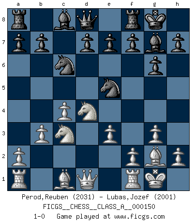 Last move : 1-0 2014 July 11 2:28:16 [Event "FICGS__CHESS__CLASS_A__000150"] [Site "FICGS"] [Date "2014.05.17"] [Round "1"] [White "Perod,Reuben"] [Black "Lubas,Jozef"] [Result "1-0"] [WhiteElo "2031"] [BlackElo "2001"] 1.Nf3 Nf6 2.c4 c5 3.Nc3 Nc6 4.g3 g6 5.d4 cxd4 6.Nxd4 Bg7 7.Bg2 Ng4 8.e3 Nge5 9.b3 O-O 10.O-O 1-0 Reti Opening Kingside Castling by player Black (move 9) Kingside Castling by player White (move 10) Player White won this chess game. Follow this game move after move (download)Half the variations which are calculated in a tournament game turn out to be completely superfluous. Unfortunately, no one knows in advance which half. (Jan Tinman) Der 70jährige Viktor Kortschnoi: Die Rentenanstalt wollte mich zwingen in Rente zu gehen. Meine Frau erhält jetzt eine Pension- und ich zahle weiter in die Rentenkasse ein! (Viktor Kortschnoi) Tu sabes que vas a perder. Aún cuando tenía la ventaja, yo sabía que iba a perder. - al estar jugando con Fischer (Andrew Soltis) Toute estimation doit être constamment réévaluée. (Jacob Estrin) Yoga is 99% practice and 1% knowledge. (Sri Krishna Pattabhi Jois)