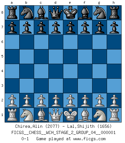 Last move : 0-1 2007 March 18 1:11:7 [Event "FICGS__CHESS__WCH_STAGE_2_GROUP_04__000001"] [Site "FICGS"] [Date "2007.02.15"] [Round "1"] [White "Chirea,Alin"] [Black "Lal,Shijith"] [Result "0-1"] [WhiteElo "2077"] [BlackElo "1656"] 0-1 This chess game has been lost on time (started : 2007.02.15 23:35:34) Player Black won this chess game. Follow this game move after move (download)You know you're going to lose. Even when I was ahead I knew I was going to lose. - On playing against Fischer. (Andrew Soltis) Ich moechte nie einem Club beitreten, der Leute wie mich als Mitglieder aufnimmt. (Woody Allen) El Ajedrez es 99 por ciento táctica. (Teichmann) Le succès, c'est être capable d'aller d'échec en échec sans perdre son enthousiasme. (Winston Churchill) He is a liar. I just don't know what the lie is yet. (Horatio Caine, C.S.I. Miami)