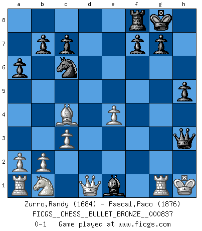 Last move : 0-1 2014 May 22 3:50:37 [Event "FICGS__CHESS__BULLET_BRONZE__000837"] [Site "FICGS"] [Date "2014.05.22"] [Round "1"] [White "Zurro,Randy"] [Black "Pascal,Paco"] [Result "0-1"] [WhiteElo "1684"] [BlackElo "1876"] 1.e4 e5 2.Nf3 Nc6 3.c3 a6 4.Bc4 Nf6 5.h3 d5 6.exd5 Nxd5 7.O-O e4 8.Nh2 Nf4 9.d3 Qg5 10.Bxf4 Qxf4 11.g3 Qe5 12.dxe4 Bxh3 13.Ng4 Bxg4 14.Qxg4 Bc5 15.Re1 O-O 16.Kh2 Bxf2 17.Re2 Bxg3+ 18.Kh1 Rad8 19.Rg2 Rd1+ 20.Rg1 Be1 21.Kg2 h5 22.Qxd1 Qg3+ 23.Kh1 Qh3+ 0-1 Ponziani Opening Kingside Castling by player White (move 7) Kingside Castling by player Black (move 15) Player Black won this chess game. Follow this game move after move (download)Combinations have always been the most intriguing aspect of Chess. The masters look for them, the public applauds them, the critics praise them. It is because combinations are possible that Chess is more than a lifeless mathematical exercise. They are the poetry of the game; they are to Chess what melody is to music. They represent the triumph of mind over matter. (Reuben Fine) Schach ist wie eine schöne Frau, zu der wir ständig zurückkehren, gleichviel, wie oft sie uns zurückweist. (Anonymous) La única cosa que los jugadores de Ajedrez tienen en común, es el Ajedrez. (Lodewijk Prins) Les erreurs sont comme les malheurs, elles n'arrivent jamais seules. (Siegbert Tarrasch) The bottom line is always the bottom line. (Johann Piek)