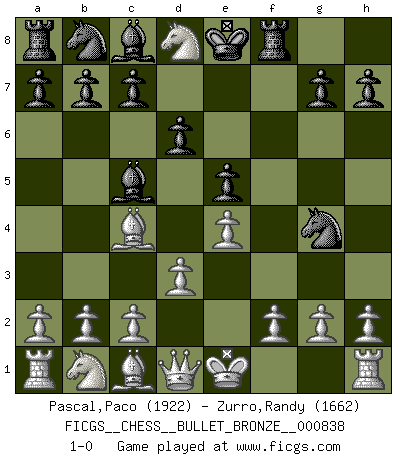 Last move : 1-0 2014 May 22 5:3:54 [Event "FICGS__CHESS__BULLET_BRONZE__000838"] [Site "FICGS"] [Date "2014.05.22"] [Round "1"] [White "Pascal,Paco"] [Black "Zurro,Randy"] [Result "1-0"] [WhiteElo "1922"] [BlackElo "1662"] 1.e4 e5 2.Nf3 Nf6 3.Bc4 Bc5 4.d3 d6 5.Ng5 Ng4 6.Nxf7 Rf8 7.Nxd8 1-0 Petrov : Italian variation Player White won this chess game. Follow this game move after move (download)I prefer to lose a really good game than to win a bad one. (David Levy) Taktik ist was man tun muß, wenn etwas zu tun ist. Strategie ist was man tun muß, wenn nichts zu tun ist. (Savielly Grigorievitsch Tartakower) Desconfianza es la característica mas necesaria de un jugador de Ajedrez. (Siegbert Tarrasch) Les ravages du H expliquent la différence de niveau entre Tal et Thal [Abergel]. When you have everything, sometimes it feels like nothing. (Horatio Caine, C.S.I. Miami)