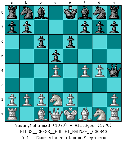 Last move : 0-1 2014 May 22 9:40:25 [Event "FICGS__CHESS__BULLET_BRONZE__000840"] [Site "FICGS"] [Date "2014.05.22"] [Round "1"] [White "Yawar,Mohammad"] [Black "Ali,Syed"] [Result "0-1"] [WhiteElo "1970"] [BlackElo "1770"] 1.d4 d5 2.Nd2 e6 3.f4 c6 4.g4 Qh4+ 0-1 This chess game has been lost on time (started : 2014.05.22 9:2:24) Queen's pawn game Player Black won this chess game. Follow this game move after move (download)I'm not afraid of Spassky. The world knows I'm the best. You don't need a match to prove it. (Bobby Fischer) Ich weiss nicht was Gott gegen mich auf 1.e4 antworten würde. (Robert James Fischer) Bobby es el jugador de Ajedrez mas fino que este país jamás haya producido. Su memoria para las movidas, su brillantez en soñar combinaciones y su feróz determinación por la victoria son algo extraño. (John Collins) Les réformistes prétendent que les progrès de la théorie conduiront à la disparition des échecs, et qu'il faut, pour leur rendre vie, en remanier les règles. En réalité, qu'exprime cette affirmation? Le mépris de l'intuition, de l'imagination et de tous les autres éléments qui font des échecs un art. (Alexander Alekhine) May the force be with you. (Han Solo in Star Wars ep.4)