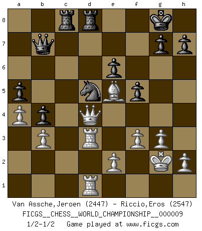 Last move : 1/2-1/2 2014 October 15 21:42:27 [Event "FICGS__CHESS__WORLD_CHAMPIONSHIP__000009"] [Site "FICGS"] [Date "2014.05.23"] [Round "4"] [White "Van Assche,Jeroen"] [Black "Riccio,Eros"] [Result "1/2-1/2"] [WhiteElo "2447"] [BlackElo "2547"] 1.d4 d5 2.c4 e6 3.Nf3 Nf6 4.g3 Be7 5.Bg2 O-O 6.O-O dxc4 7.Qc2 b5 8.a4 b4 9.Nbd2 Bb7 10.Nxc4 c5 11.Rd1 Nbd7 12.Be3 Rc8 13.Nfe5 Bxg2 14.Kxg2 cxd4 15.Bxd4 Nxe5 16.Bxe5 Qb6 17.b3 Qb7+ 18.f3 Nd5 19.Qe4 Rfd8 20.Rd3 f5 21.Qd4 Nb6 22.Nd6 Bxd6 23.Bxd6 Nd5 24.Be5 a5 25.Rad1 1/2-1/2 Queen's gambit declined Kingside Castling by player Black (move 5) Kingside Castling by player White (move 6) This chess game ended in a draw. Follow this game move after move (download)A sacrifice is best refuted by accepting it. (Wilhelm Steinitz) Ich kenne keine einzige Person, die behaupten würde, Garri Kasparow sei ein guter Mensch (Nigel Short) Prefiero perder una partida realmente buena, que ganar una mala. (David Levy) Il vaut toujours mieux jouer un plan faux de façon logique que de n'avoir pas de plan du tout. (Victor Kortchnoï) There are two major products that came out of Berkeley: LSD and UNIX. We do not believe this is to be a coincidence. (Jeremy S. Anderson)