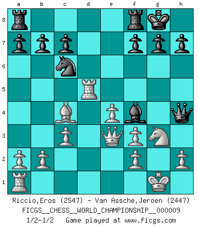 Last move : 1/2-1/2 2014 September 7 15:34:10 [Event "FICGS__CHESS__WORLD_CHAMPIONSHIP__000009"] [Site "FICGS"] [Date "2014.05.23"] [Round "5"] [White "Riccio,Eros"] [Black "Van Assche,Jeroen"] [Result "1/2-1/2"] [WhiteElo "2547"] [BlackElo "2447"] 1.e4 e5 2.Nf3 Nc6 3.Bb5 Nf6 4.d3 Bc5 5.c3 d5 6.exd5 Qxd5 7.Bc4 Qd6 8.O-O e4 9.Qe2 O-O 10.dxe4 Bg4 11.Rd1 Bxf3 12.gxf3 Qe5 13.Nd2 Nh5 14.Nf1 Nf4 15.Bxf4 Qxf4 16.Rd5 Bd6 17.Qe3 Qh4 18.Ng3 Bf4 1/2-1/2 Ruy Lopez : Berlin defense Kingside Castling by player White (move 8) Kingside Castling by player Black (move 9) This chess game ended in a draw. Follow this game move after move (download)Some part of a mistake is always correct. (Savielly Tartakover) Die westlichen Werte sind eine Sprache, welche die Putin-Administration nicht versteht. (Garry Kasparov) Sin errores no puede haber brillantez. (Emanuel Lasker) 'L'échange des dames est un coup dur pour les deux adversaires...' Un journaliste lors d'une partie du match Spassky-Fischer Just because you do not take an interest in politics doesn't mean politics won't take an interest in you. (Pericles 430 B.C.)