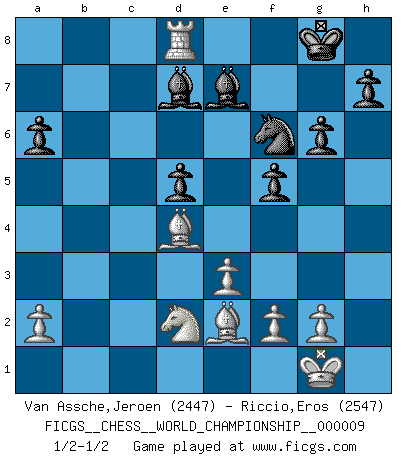 Last move : 1/2-1/2 2014 November 22 20:27:20 [Event "FICGS__CHESS__WORLD_CHAMPIONSHIP__000009"] [Site "FICGS"] [Date "2014.05.23"] [Round "6"] [White "Van Assche,Jeroen"] [Black "Riccio,Eros"] [Result "1/2-1/2"] [WhiteElo "2447"] [BlackElo "2547"] 1.d4 d5 2.c4 c6 3.Nf3 Nf6 4.e3 e6 5.b3 Nbd7 6.Bd3 Bd6 7.Bb2 O-O 8.Nbd2 b6 9.O-O Bb7 10.Ne5 c5 11.cxd5 exd5 12.Rc1 Qe7 13.Nxd7 Nxd7 14.Re1 Rfe8 15.Qh5 g6 16.Qh6 Rac8 17.Bb5 f5 18.h4 a6 19.dxc5 bxc5 20.Be2 Nf6 21.Red1 Rc7 22.Qg5 Rf8 23.h5 Nxh5 24.Qxe7 Bxe7 25.b4 Nf6 26.bxc5 Rxc5 27.Bd4 Rxc1 28.Rxc1 Rd8 29.Rb1 Bc8 30.Rb8 Bd7 31.Rxd8+ 1/2-1/2 QGD Slav : 4.e3 Kingside Castling by player Black (move 7) Kingside Castling by player White (move 9) This chess game ended in a draw. Follow this game move after move (download)I thought the most common mistake [in chess] was the first one: Learning the game :P (Garvin Gray, FICGS forum) Schach ist ein Teil der Kultur, und wenn es mit der Kultur abwärts geht, geht es auch mit dem Schach abwärts. (Mikhail Moiseyevich Botvinik) Dejen al perfeccionista jugar por correo. (Yasser Seirawan) Les échecs, c'est l'art d'analyser. (Mikhail Botvinnik) Vladimir Ras-Putin is still alive... He is also a good actor, I saw him in the Lord of the Rings. (Rodolfo d'Ettorre)