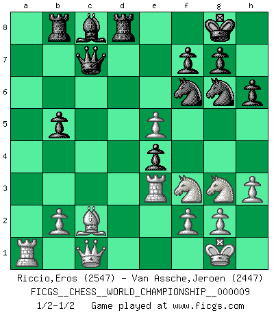 Last move : 1/2-1/2 2014 October 15 20:20:15 [Event "FICGS__CHESS__WORLD_CHAMPIONSHIP__000009"] [Site "FICGS"] [Date "2014.05.23"] [Round "9"] [White "Riccio,Eros"] [Black "Van Assche,Jeroen"] [Result "1/2-1/2"] [WhiteElo "2547"] [BlackElo "2447"] 1.e4 e5 2.Nf3 Nc6 3.Bb5 a6 4.Ba4 Nf6 5.d3 Bc5 6.O-O b5 7.Bb3 d6 8.c3 h6 9.h3 O-O 10.Re1 Bb6 11.Nbd2 Ne7 12.Nf1 Ng6 13.a4 Rb8 14.axb5 axb5 15.Ng3 c5 16.Bc2 Qc7 17.Be3 d5 18.d4 cxd4 19.cxd4 dxe4 20.dxe5 Rd8 21.Qc1 Bxe3 22.Rxe3 1/2-1/2 Ruy Lopez : Anderssen variation Kingside Castling by player White (move 6) Kingside Castling by player Black (move 9) This chess game ended in a draw. Follow this game move after move (download)Of Chess it has been said that life is not long enough for it, but that is the fault of life, not Chess. (William Ewart Napier) Ich verachte die Medien. (Robert James Fischer) Mis oponentes también hacen buenas movidas. A veces yo no tomo esas cosas en consideración. (Bobby Fischer) Comme les marins qui ont mille raisons différentes d'aller en mer, les joueurs d'échecs en ont tout autant avant de s'installer devant une table et jouer... (Vincent Bertignac, philosophe) All art requires courage. (Anne Tucker)