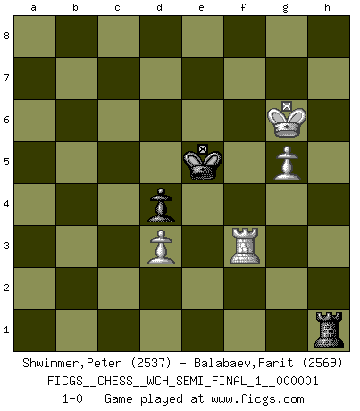 Last move : 1-0 2007 June 14 8:54:44 [Event "FICGS__CHESS__WCH_SEMI_FINAL_1__000001"] [Site "FICGS"] [Date "2007.02.15"] [Round "2"] [White "Shwimmer,Peter"] [Black "Balabaev,Farit"] [Result "1-0"] [WhiteElo "2537"] [BlackElo "2569"] 1.Nc3 d5 2.e3 Nf6 3.f4 c5 4.Nf3 g6 5.Bb5+ Bd7 6.Bxd7+ Nbxd7 7.d3 Bg7 8.e4 d4 9.Ne2 Qc7 10.c3 dxc3 11.Nxc3 e5 12.fxe5 Nxe5 13.O-O O-O 14.Bf4 Nxf3+ 15.Qxf3 Qd7 16.Be5 Nh5 17.Bxg7 Nxg7 18.Nd5 f5 19.Rae1 Rad8 20.Qd1 Kh8 21.Qc1 b6 22.Qc3 Qa4 23.b3 Qd4+ 24.Qxd4 cxd4 25.Ne7 f4 26.Rc1 Ne6 27.Nd5 g5 28.Nc7 Nxc7 29.Rxc7 Rc8 30.Rfc1 Rxc7 31.Rxc7 g4 32.Kf2 Kg8 33.h3 h5 34.hxg4 hxg4 35.e5 f3 36.Rd7 g3+ 37.Kf1 Rf5 38.e6 Kf8 39.Rxa7 f2 40.Ra8+ Ke7 41.Rg8 Ra5 42.a4 b5 43.Rxg3 bxa4 44.bxa4 Rxa4 45.Kxf2 Ra3 46.Rf3 Ra2+ 47.Kg3 Kxe6 48.Kh3 Ra8 49.g4 Rh8+ 50.Kg3 Rh1 51.g5 Ke5 52.Kg4 Rg1+ 53.Kh5 Rh1+ 54.Kg6 1-0 Dunst (Sleipner, Heinrichsen) Opening Kingside Castling by player White (move 13) Kingside Castling by player Black (move 13) 10 pieces endgame at move 44 : White KRPPPP , Black KRPP WHITE : King + 1 Rook 4 Pawns BLACK : King + 1 Rook 2 Pawns 9 pieces endgame at move 44 : White KRPPP , Black KRPP WHITE : King + 1 Rook 3 Pawns BLACK : King + 1 Rook 2 Pawns 8 pieces endgame at move 45 : White KRPPP , Black KRP WHITE : King + 1 Rook 3 Pawns BLACK : King + 1 Rook 1 Pawn 7 pieces endgame at move 47 : White KRPP , Black KRP WHITE : King + 1 Rook 2 Pawns BLACK : King + 1 Rook 1 Pawn Player White won this chess game. Follow this game move after move (download)I am still a victim of Chess. It has all the beauty of art and much more. It cannot be commercialized. Chess is much purer than art in its social position. (Marcel Duchamp) Ich verachte Kasparow. (Viktor Kortschnoi) Fischer sacrificó virtualmente todo lo que la mayoría de nosotros los 'debiles' (término que él usa) valoramos, respetamos y apreciamos por el amor de un astuto, a menudo hermoso tablero de juego, por el privilegio ambivalente de ser su mas grande maestro. (Paul Kollar) Shah mat. Le roi est mort. Cri de fierté d'un joueur venant de terrasser son adversaire, courtoisement, sans effusion de sang. I find television to be very educating. Every time somebody turns on the set, I go in the other room and read a book. (Groucho Marx)
