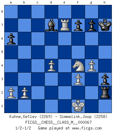 Last move : 1/2-1/2 2014 July 3 23:26:4 [Event "FICGS__CHESS__CLASS_M__000067"] [Site "FICGS"] [Date "2014.05.25"] [Round "1"] [White "Kuhne,Detlev"] [Black "Simmelink,Joop"] [Result "1/2-1/2"] [WhiteElo "2269"] [BlackElo "2258"] 1.e4 e5 2.Nf3 Nc6 3.Bb5 a6 4.Ba4 Nf6 5.O-O Be7 6.Re1 b5 7.Bb3 O-O 8.c3 d5 9.exd5 Nxd5 10.Nxe5 Nxe5 11.Rxe5 c6 12.d4 Bd6 13.Re2 Bg4 14.f3 Bf5 15.g3 Qc7 16.Kg2 Rae8 17.c4 bxc4 18.Bxc4 h5 19.Bxd5 cxd5 20.Nc3 h4 21.Nxd5 Qd7 22.Bf4 Rxe2+ 23.Qxe2 Bxf4 24.Nxf4 h3+ 25.Kf1 Rc8 26.Re1 Rc2 27.Qe8+ Kh7 28.Qxd7 Bxd7 29.g4 Rxh2 30.Re7 1/2-1/2 Ruy Lopez : Closed, 7...O-O Kingside Castling by player White (move 5) Kingside Castling by player Black (move 7) This chess game ended in a draw. Follow this game move after move (download)Whoever sees no other aim in the game than that of giving checkmate to one's opponent will never become a good Chess player. (Euwe) Darum geht es im Schach. Einen Tag gibst du deinem Gegner eine Lektion, am nächsten Tag gibt er dir eine. (Robert James Fischer) En el tablero, la mentira e hipocresía no sobreviven mucho. (Emanuel Lasker) Vous m'avez demandé de vous exposer quel est le fondement de la prière. Je ne fais que préparer les pièces du jeu sur la table... Nous sera-t-il permis d'en adopter les règles et si nous les appliquons scrupuleusement nous ne tarderons pas à faire mat le Roi divin ! Il ne pourra échapper à nos mains. (Sainte Thérèse d'Avila, Chemin de perfection) Do not put your faith in what statistics say until you have carefully considered what they do not say. (William W. Watt)