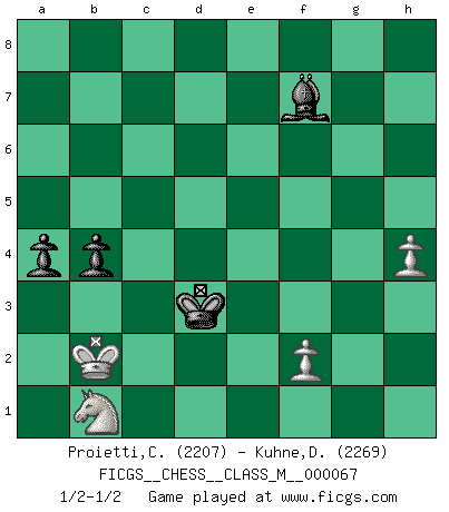 Last move : 1/2-1/2 2014 December 19 14:38:35 [Event "FICGS__CHESS__CLASS_M__000067"] [Site "FICGS"] [Date "2014.05.25"] [Round "1"] [White "Proietti,Costantino"] [Black "Kuhne,Detlev"] [Result "1/2-1/2"] [WhiteElo "2207"] [BlackElo "2269"] 1.d4 d5 2.c4 c6 3.Nf3 Nf6 4.Nc3 e6 5.Bg5 h6 6.Bh4 dxc4 7.e4 g5 8.Bg3 b5 9.Be2 Bb7 10.O-O Nbd7 11.Ne5 h5 12.Nxd7 Qxd7 13.Qc1 Rg8 14.Rd1 Bb4 15.Qe3 Ng4 16.Bxg4 hxg4 17.Rac1 a6 18.b3 cxb3 19.axb3 Qe7 20.Rd3 f5 21.Be5 O-O-O 22.Rd2 Rge8 23.Qd3 Rf8 24.Qg3 Bd6 25.Ne2 Kb8 26.Bxd6+ Qxd6 27.Rc5 Qxg3 28.Nxg3 Rfe8 29.Kf1 a5 30.Ke2 Kc7 31.exf5 exf5 32.Kd3 f4 33.Ne4 Ba6 34.Nf6 Re1 35.Rxg5 Bc8 36.d5 Rd6 37.Nh5 f3 38.Nf4 Kb6 39.gxf3 gxf3 40.Kc3 b4+ 41.Kc2 Re4 42.Nh5 Rxd5 43.Rgxd5 cxd5 44.Nf6 Re1 45.Nxd5+ Kc6 46.Nf4 Bf5+ 47.Kb2 Re4 48.Nh5 Re2 49.Kc1 Be6 50.Rc2+ Kb6 51.Nf4 Bxb3 52.Rxe2 fxe2 53.Nxe2 Kc5 54.Kb2 a4 55.Nc3 Kc4 56.Nb1 Kd3 57.h4 Bf7 1/2-1/2 Comment by player 1 : Costantino Proietti : What a difficult game! My opponent played very accurate moves. I overstimate the position, so I played 20. Rd3? instead the theoretical 20.d5 and after 21...0-0-0! the position quickly went hard to defend for W. I think I was lucky to choose the correct defence strategy moving the King (30.Ke2) to the queen side to stop the passed pawns but for the entire game I was certain to lose so I have to be very happy to save the half point and very proud for having played very precisely. A draw having the taste of a win! QGD Slav : 4.Nc3 Kingside Castling by player White (move 10) Queenside Castling by player Black (move 21) 10 pieces endgame at move 52 : White KRNPP , Black KBPPP WHITE : King + 1 Rook 1 Knight 2 Pawns BLACK : King + 1 Bishop 3 Pawns 9 pieces endgame at move 52 : White KNPP , Black KBPPP WHITE : King + 1 Knight 2 Pawns BLACK : King + 1 Bishop 3 Pawns 8 pieces endgame at move 53 : White KNPP , Black KBPP WHITE : King + 1 Knight 2 Pawns BLACK : King + 1 Bishop 2 Pawns This chess game ended in a draw. Follow this game move after move (download)We must make sure that Chess will not be like a dead language, very interesting, but for a very small group. (Sytze Faber) Im Wettkampf zwischen starken Meistern kommen Fehler sehr selten vor, deshalb ist es mit bloßem Warten nicht getan. (José Raúl Capablanca) Con el tiempo, empecé a progresar en partidas decisivas. Tal vez porque me di cuenta de una simple verdad: no solo estaba yo nervioso sino también mi oponente. (Mikhail Tal) Demandez au pauvre Cg1 ce qu'il en pense. Eduard Gufeld à propos de la variante Saemisch de l'Est-Indienne. Life is like a play: it's not the length but the excellence of the acting that matters. (Seneca)