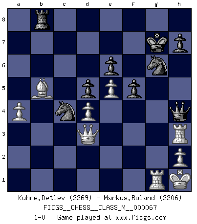 Last move : 1-0 2014 August 25 20:49:33 [Event "FICGS__CHESS__CLASS_M__000067"] [Site "FICGS"] [Date "2014.05.25"] [Round "1"] [White "Kuhne,Detlev"] [Black "Markus,Roland"] [Result "1-0"] [WhiteElo "2269"] [BlackElo "2206"] 1.e4 c6 2.d4 d5 3.e5 Bf5 4.Nf3 e6 5.Be2 c5 6.c3 Nd7 7.O-O Ne7 8.dxc5 Nc6 9.Nd4 Bxb1 10.Rxb1 Bxc5 11.b4 Bb6 12.f4 O-O 13.Kh1 a5 14.bxa5 Rxa5 15.a4 g6 16.Bb5 Bxd4 17.cxd4 Ra8 18.g4 f5 19.gxf5 Rxf5 20.Bd3 Rh5 21.Be2 Rh4 22.Rxb7 Kh8 23.f5 gxf5 24.Bf4 Rxf4 25.Rxf4 Na5 26.Rb1 Nf8 27.Bb5 Ng6 28.Rf3 Qh4 29.Qd3 Rb8 30.Rc1 Nc4 31.Rg1 Kg7 32.Rh3 1-0 Caro-Kann : Advance variation Kingside Castling by player White (move 7) Kingside Castling by player Black (move 12) Player White won this chess game. Follow this game move after move (download)Chess is a beautiful mistress. (Bent Larsen) Im Hotelzimmer gab es nur zwei Schaben. (Über die Turnierbedingungen) (Peter Swidler) Entre mas años cumplo, mas valoro los Peones. (Keres) Nous vivons dans un monde échiquéen : chaque jour qui passe est un défi à relever. (Philosophe Sasha) Wisdom doesn't necessarily come with age. Sometimes age just shows up all by itself. (Tom Wilson)