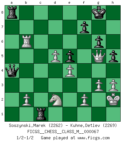 Last move : 1/2-1/2 2014 July 6 23:31:15 [Event "FICGS__CHESS__CLASS_M__000067"] [Site "FICGS"] [Date "2014.05.25"] [Round "1"] [White "Soszynski,Marek"] [Black "Kuhne,Detlev"] [Result "1/2-1/2"] [WhiteElo "2262"] [BlackElo "2269"] 1.d4 d5 2.c4 c6 3.Nf3 Nf6 4.Nc3 e6 5.Bg5 h6 6.Bxf6 Qxf6 7.e3 Nd7 8.Bd3 dxc4 9.Bxc4 g6 10.O-O Bg7 11.Re1 O-O 12.e4 e5 13.d5 Rd8 14.a3 Nb6 15.Bb3 Bg4 16.Re3 Rac8 17.h3 Bd7 18.Qe2 Qd6 19.Rd1 c5 20.Nd2 h5 21.a4 Bh6 22.a5 Bxe3 23.Qxe3 c4 24.axb6 cxb3 25.bxa7 b5 26.Ra1 Ra8 27.Nxb3 Rdc8 28.Ra5 Rc7 29.Nxb5 Bxb5 30.Rxb5 Rcxa7 31.Nd2 Qf6 32.Kh2 Ra1 33.g3 Qa6 34.Rb6 Qa4 35.Qg5 Rc1 1/2-1/2 QGD Slav : 4.Nc3 Kingside Castling by player White (move 10) Kingside Castling by player Black (move 11) This chess game ended in a draw. Follow this game move after move (download)The blunders are all there on the board, waiting to be made. (Savielly Tartakover) Schach ist die gewalttätigste aller Sportarten. (Garry Kasparov) El Ajedrez moderno está demasiado preocupado con cosas como la estructura de Peones. Olvidenlo, el Jaque Mate termina la partida. (Nigel Short) Seul un grand joueur sait à quel point il joue faiblement. (Xavier Tartacover) No enterprise is more likely to succeed than one concealed from the enemy until it is ripe for execution. (Niccolo Machiavelli)
