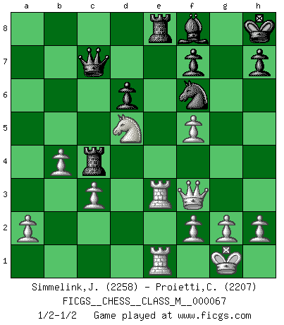 Last move : 1/2-1/2 2014 June 17 19:17:52 [Event "FICGS__CHESS__CLASS_M__000067"] [Site "FICGS"] [Date "2014.05.25"] [Round "1"] [White "Simmelink,Joop"] [Black "Proietti,Costantino"] [Result "1/2-1/2"] [WhiteElo "2258"] [BlackElo "2207"] 1.e4 c5 2.Nf3 Nc6 3.d4 cxd4 4.Nxd4 e6 5.Nc3 Nf6 6.Ndb5 d6 7.Bf4 e5 8.Bg5 a6 9.Na3 b5 10.Bxf6 gxf6 11.Nd5 f5 12.Bd3 Be6 13.c3 Bg7 14.Nxb5 axb5 15.Bxb5 Rc8 16.Qa4 Bd7 17.exf5 O-O 18.O-O e4 19.Rfe1 Ne5 20.Bxd7 Nxd7 21.Qxe4 Nf6 22.Ne7+ Kh8 23.Qf3 Rc5 24.b4 Rc4 25.Rad1 Qc7 26.Rd3 Re8 27.Rde3 Bf8 28.Nd5 1/2-1/2 Sicilian defense Kingside Castling by player Black (move 17) Kingside Castling by player White (move 18) This chess game ended in a draw. Follow this game move after move (download)Do you realize Fischer almost never has any bad pieces? He exchanges them, and the bad pieces remain with his opponents. (Yuri Balashov) Das Schach ist nichts für kleine Geister, es beansprucht einen vollen Mann, der sich nicht sklavisch an das Überlieferte hält, sondern selbständig die Tiefen des Spiels zu ergründen sucht. (Wilhelm Steinitz) Realmente no sabemos como el juego fue inventado, aunque hay sospechas. Tan pronto como descubramos a los culpables, se los haremos saber. (Bruce Pandolfini) Lorsque vous vous retrouvez devant une position atroce, ne tendez pas un ultime piège dérisoire avec l'intention d'abandonner si l'adversaire le déjoue ! Faites-vous plutôt un devoir de résister comme si votre vie en dépendait. Jouez le coup qui vous déplairait au centuple si vous étiez dans la peau de votre tortionnaire ! If you work for a living, why do you kill yourself working ? (Tuco to a chicken in The Good, The Bad and The Ugly)
