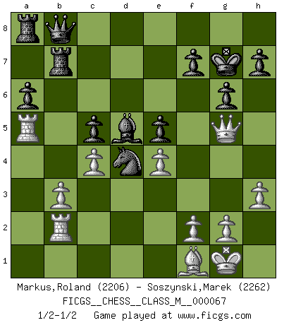 Last move : 1/2-1/2 2014 August 1 20:56:10 [Event "FICGS__CHESS__CLASS_M__000067"] [Site "FICGS"] [Date "2014.05.25"] [Round "1"] [White "Markus,Roland"] [Black "Soszynski,Marek"] [Result "1/2-1/2"] [WhiteElo "2206"] [BlackElo "2262"] 1.e4 e5 2.Nf3 Nc6 3.Bb5 a6 4.Ba4 Nf6 5.O-O Be7 6.Re1 b5 7.Bb3 d6 8.c3 O-O 9.h3 Nb8 10.d4 Nbd7 11.Nbd2 Bb7 12.Bc2 Re8 13.b3 c6 14.Bb2 Qc7 15.a4 Bf8 16.Bd3 g6 17.Qc2 Nh5 18.Bf1 Bg7 19.c4 bxa4 20.Rxa4 exd4 21.Bxd4 c5 22.Bxg7 Nxg7 23.Nb1 Bc6 24.Ra1 Ne6 25.Qd3 Ne5 26.Nxe5 dxe5 27.Nc3 Nd4 28.Nd5 Qd6 29.Ra5 Reb8 30.Rb1 Rb7 31.Qg3 Kg7 32.Rb2 Qb8 33.Qg5 Bxd5 1/2-1/2 Ruy Lopez : Closed Kingside Castling by player White (move 5) Kingside Castling by player Black (move 8) This chess game ended in a draw. Follow this game move after move (download)A player surprised is half beaten. (Proverb) Das ganze Leben mit einer Ehefrau ist wie ein Endspiel mit ungleichfarbigen Läufern. (Viktor Kortschnoi) Entre mas años cumplo, mas valoro los Peones. (Keres) Roi des jeux et jeu des rois, les échecs portent en eux un sentiment d'infini. Ils donnent à celui qui s'est efforcé d'en approfondir les arcanes l'impression de n'être pas à la mesure de l'homme; en fait, ils constituent un résumé de l'univers, un microcosme, et figurent cette grande échelle qui, dans les plans de la lumière descend jusqu'à la matière, qui des abîmes insondables remonte jusqu'en l'infini de Dieu. (Pyrame) It is a good thing for an uneducated man to read books of quotations. (Winston Churchill)