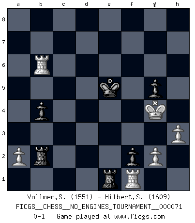 Last move : 0-1 2014 July 19 12:17:50 [Event "FICGS__CHESS__NO_ENGINES_TOURNAMENT__000071"] [Site "FICGS"] [Date "2014.05.25"] [Round "1"] [White "Vollmer,Steve"] [Black "Hilbert,Stephan J."] [Result "0-1"] [WhiteElo "1551"] [BlackElo "1609"] 1.Nf3 d6 2.d4 g6 3.e4 Bg7 4.Bc4 Nf6 5.Nc3 O-O 6.O-O c6 7.h3 b5 8.Bd3 Nbd7 9.Be3 a5 10.Qd2 b4 11.Ne2 Bb7 12.Rac1 c5 13.Ng3 c4 14.Bxc4 Nxe4 15.Nxe4 Bxe4 16.Ng5 d5 17.Nxe4 dxc4 18.f4 Nf6 19.Nc5 Nd5 20.c3 Nxe3 21.Qxe3 Rc8 22.f5 Re8 23.fxg6 hxg6 24.Qf3 f5 25.Ne6 Qd6 26.Nxg7 Kxg7 27.Rce1 e5 28.dxe5 Rxe5 29.Rd1 Qc7 30.Rd4 Rce8 31.Qd1 Qc5 32.Kh1 Re2 33.Rd8 Qc6 34.Qd7+ Qxd7 35.Rxd7+ Kf6 36.cxb4 axb4 37.Rc7 Rxb2 38.Rxc4 R8e2 39.Rg1 g5 40.Rc6+ Ke5 41.Rb6 f4 42.Kh2 f3 43.Kg3 f2 44.Rf1 Re3+ 45.Kg4 Re1 0-1 Reti Opening Kingside Castling by player Black (move 5) Kingside Castling by player White (move 6) Player Black won this chess game. Follow this game move after move (download)Chess demands total concentration. (Bobby Fischer) Im Schach gewinnt jeder. Hat man Freunde am Spiel - und das ist die Hauptsache - ist auch der Verlust einer Partie kein Unglück. (David Bronstein) Aún deseo matar a Fischer. (Boris Spassky) Toutes les manuvres exécutées sur une colonne ouverte ont pour but ultime l'intrusion définitive sur la septième ou la huitième rangée, en plein cur de la position ennemie. (Aaron Nimzovitch) Life is pleasant. Death is peaceful. It's the transition that's troublesome. (Isaac Asimov)