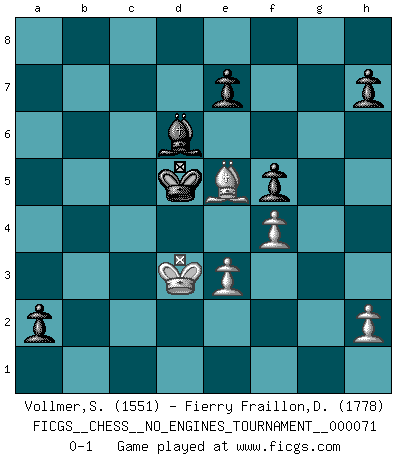 Last move : 0-1 2014 August 9 22:35:56 [Event "FICGS__CHESS__NO_ENGINES_TOURNAMENT__000071"] [Site "FICGS"] [Date "2014.05.25"] [Round "1"] [White "Vollmer,Steve"] [Black "Fierry Fraillon,David"] [Result "0-1"] [WhiteElo "1551"] [BlackElo "1778"] 1.d4 Nf6 2.c4 g6 3.Nc3 d5 4.e3 Bg7 5.Nf3 O-O 6.cxd5 Nxd5 7.Be2 c5 8.O-O Nc6 9.dxc5 Nxc3 10.bxc3 Bxc3 11.Rb1 Qxd1 12.Rxd1 Bb4 13.Ne5 Bxc5 14.Nxc6 bxc6 15.Bf3 Be6 16.Bxc6 Rad8 17.Bb2 Bxa2 18.Ra1 Rxd1+ 19.Rxd1 Be6 20.Rc1 Bb4 21.Bf3 Rc8 22.Rxc8+ Bxc8 23.Bd4 a5 24.Bc6 f6 25.f4 Kf7 26.Kf2 Ke6 27.Bb5 Bd7 28.Bc4+ Kd6 29.Ke2 Bf5 30.Bb3 Be4 31.g3 Bd5 32.Bxd5 Kxd5 33.Kd3 f5 34.Bb6 a4 35.Bd4 a3 36.Be5 g5 37.Bd4 gxf4 38.gxf4 a2 39.Be5 Bd6 0-1 King's Indian defense, 3.Nc3 Kingside Castling by player Black (move 5) Kingside Castling by player White (move 8) Player Black won this chess game. Follow this game move after move (download)Pawns: they are the soul of this game, they alone form the attack and defense. (Philidor) Wenn Schach ein enormer Dschungel ist, der seine Myriaden von Geheimnissen nicht preisgeben will, dann sind Computer die Kettensägen einer gewaltigen ökologisch unsensiblen Nutzholzfirma. (Nigel Short) Coloca el contenido de las piezas del Ajedrez en un sombrero, agitalo vigorosamente, arrojalas en un tablero desde una altura de 30 centimetros y así obtendras el estilo de Steinitz. (H. E. Bird) Seul un grand joueur sait à quel point il joue faiblement. (Xavier Tartacover) It is not true that people stop pursuing dreams because they grow old, they grow old because they stop pursuing dreams. (Gabriel Garcia Marquez)