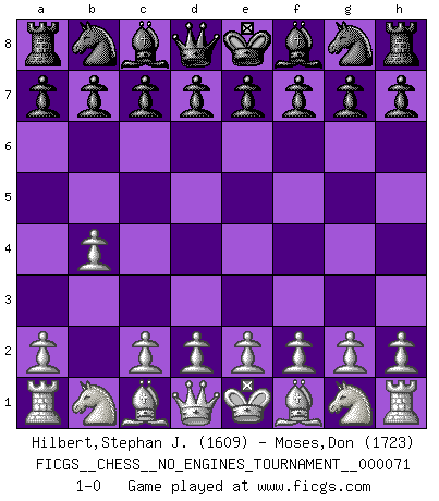 Last move : 1-0 2014 July 9 0:29:25 [Event "FICGS__CHESS__NO_ENGINES_TOURNAMENT__000071"] [Site "FICGS"] [Date "2014.05.25"] [Round "1"] [White "Hilbert,Stephan J."] [Black "Moses,Don"] [Result "1-0"] [WhiteElo "1609"] [BlackElo "1723"] 1.b4 1-0 This chess game has been lost on time (started : 2014.05.25 13:41:22) Polish (Sokolsky) opening Player White won this chess game. Follow this game move after move (download)Becoming successful at Chess allows you to discover your own personality. That's what I want for the kids I teach. (Saudin Robovic) Die größte Kunst beim Schach besteht darin dem Gegner nicht zu zeigen was er tun kann. (Garry Kasparov) Una clavada es mas poderosa que una espada. (Fred Reinfeld) Même si l'adversaire joue le coup analysé précédemment, recommencez l'analyse en voyant la nouvelle position. Première règle de Blumenfeld The hypothalamus is one of the most important parts of the brain, involved in many kinds of motivation, among other functions. The hypothalamus controls the 'Four Fs: Fighting, Fleeing, Feeding and Mating. (Unknown author)