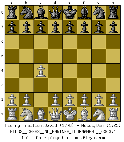 Last move : 1-0 2014 July 5 0:19:1 [Event "FICGS__CHESS__NO_ENGINES_TOURNAMENT__000071"] [Site "FICGS"] [Date "2014.05.25"] [Round "1"] [White "Fierry Fraillon,David"] [Black "Moses,Don"] [Result "1-0"] [WhiteElo "1778"] [BlackElo "1723"] 1.c4 1-0 This chess game has been lost on time (started : 2014.05.25 13:41:22) English Opening Player White won this chess game. Follow this game move after move (download)Spassky will not be psyched out by Fischer. (Mike Goodall) Darum geht es im Schach. Einen Tag gibst du deinem Gegner eine Lektion, am nächsten Tag gibt er dir eine. (Robert James Fischer) El juego de Fischer siempre fue nítido, racional y brillante. Uno de los mejores por siempre. (Dave Regis) Les échecs, c'est l'imagination. (David Bronstein) Don't be irreplaceable, if you can't be replaced, you can't be promoted. (Dan Rotaru)